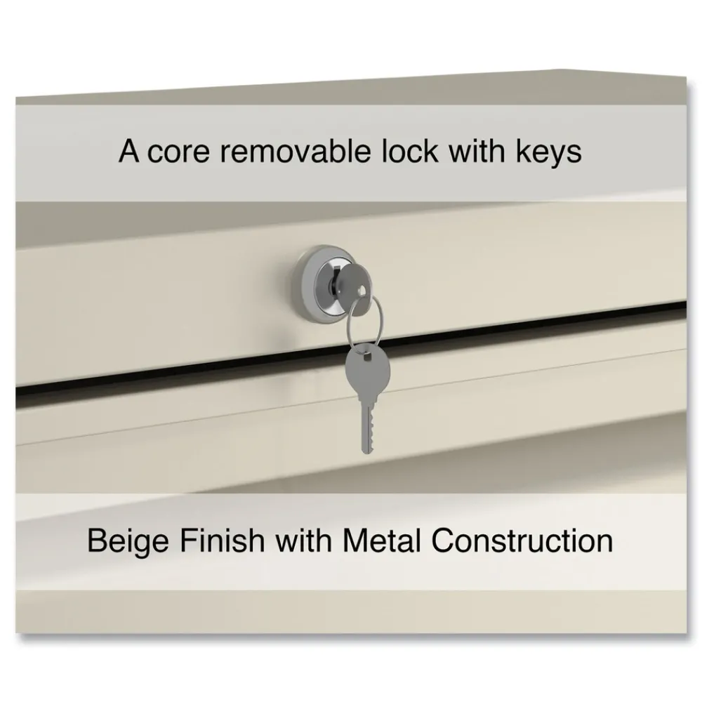 Drawers with side-to-side hang rails to accommodate letter/legal hanging files. Full drawer extension on steel ball bearing telescoping slide suspension helps drawers glide with ease. Stylish, full-width radius edge recessed pulls help to quickly open and close drawers. Anti-tipping interlock system allows only one drawer to open at a time. Single key core removable lock with 2 keys. 4 adjustable leveling glides. Durable powder coated finish helps prevent scratches.
