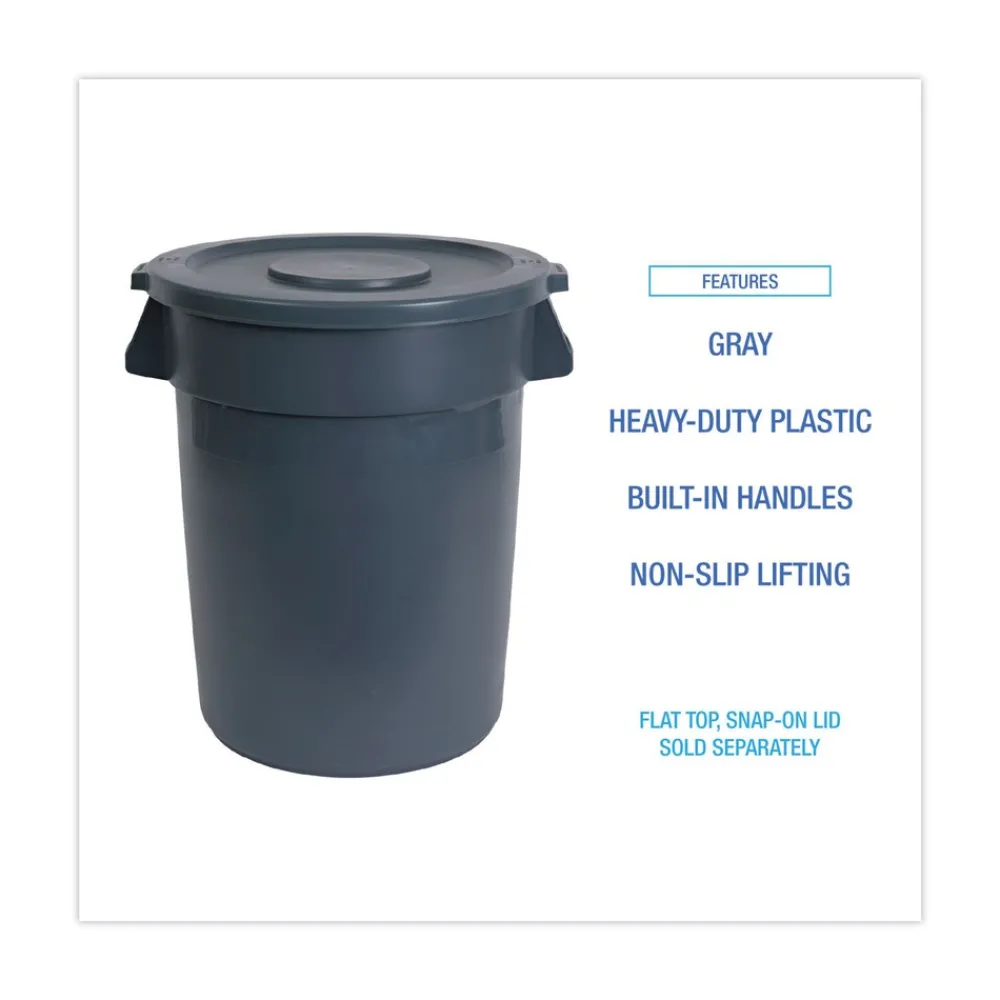A heavy-duty, round waste receptacle that’s extremely sturdy for a variety of use applications. Made from all plastic with professional-grade construction to ensure long-lasting performance. Extremely durable, will not rust, chip, or peel, even when used outdoors. The built-in handles allow for easy, non-slip lifting, and jam-proof nesting. Compatible with an optional, Boardwalk flat-top, snap-on lid in the same size, which is sold separately.