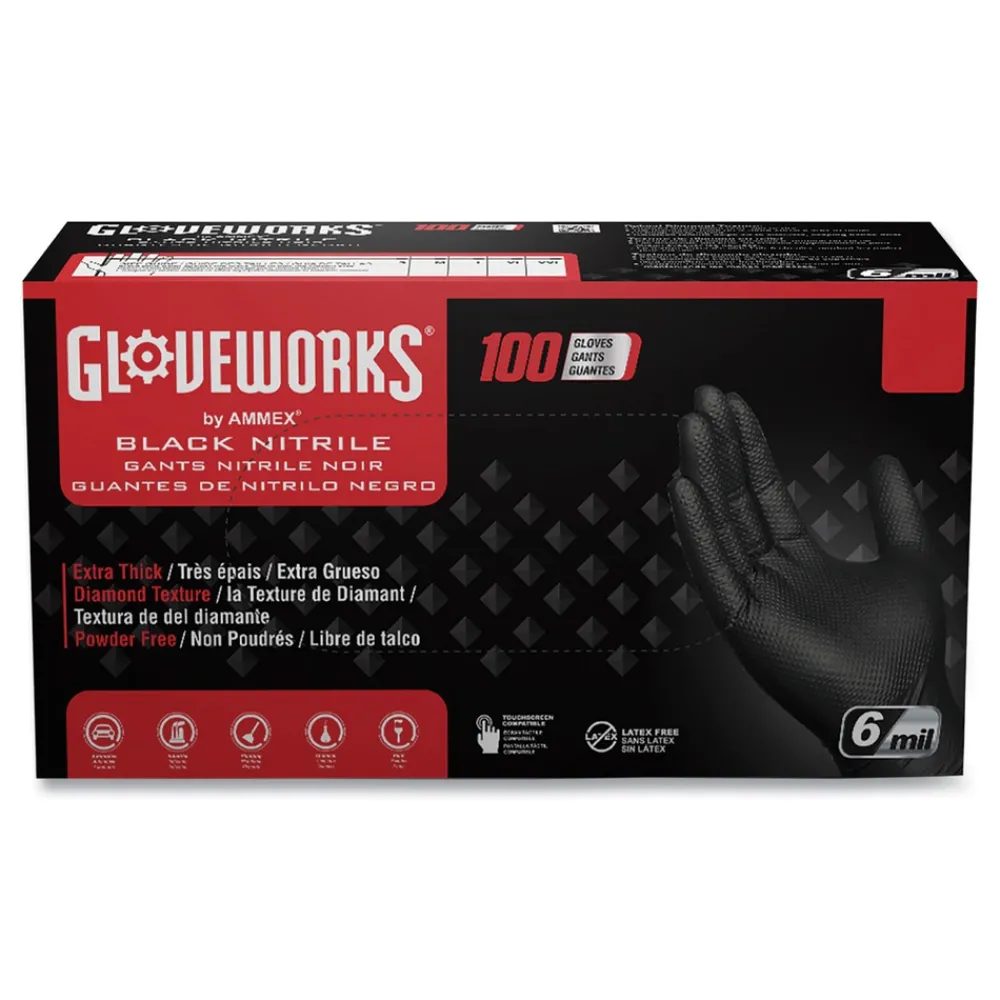 Gloveworks by AMMEX Heavy-Duty Industrial Nitrile Gloves stand up to the toughest jobs. They feature Raised Diamond Texture (RDT) which creates 60% more surface area for an exceptional liquid channeling grip. RDT provides a comfortable fit: fewer contact points with the skin increase airflow and reduce sweating vs. non-textured gloves.