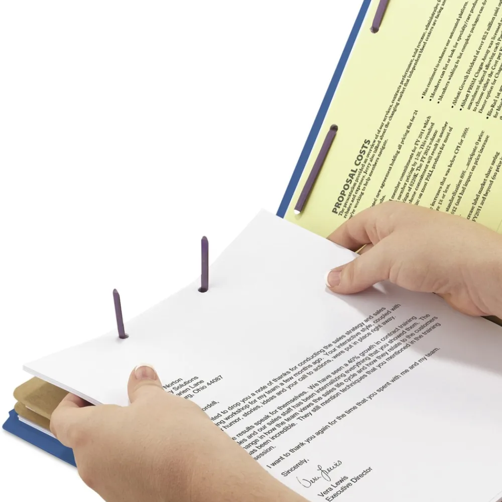 Partition folders with patented SafeSHIELD coated fasteners help prevent finger cuts, eliminate paper tears and reduce excessive fastener crinkling