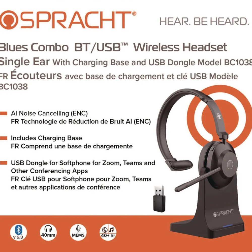 The best thing about the Monaural (single ear) Blues Combo BT/USB Wireless Headset is that it’s always wireless, and with the included dongle you can use it as Softphone on your PC/Mac computer for Zoom, Teams and other communication apps. Pair with your phone or tablet (iOS or Android) or computer (Mac/PC). If you have a Deskphone with Bluetooth capability, it will even work with that! The comfortable headband wearing style, with extra-large leatherette ear pads and headband, is ideal for those spending a lot of time wearing a headset. Easy to charge, just place the headset on the included base stand and you can charge it for up to 60 hours listening time or talk. Compatible with any Bluetooth compatible device or connect using USB cable included. Stereo sound with dual ear speakers. Control button for Mute and Unmute, Volume Up and Down, Play/Pause, Answer/Reject calls and Power On/Off. Powerful speakers and digital signal processing for top quality sound. Noise canceling microphone for ideal sound when listening or talking. Microphone rotates 270 to use left or right side, or just to set aside when not in use.
