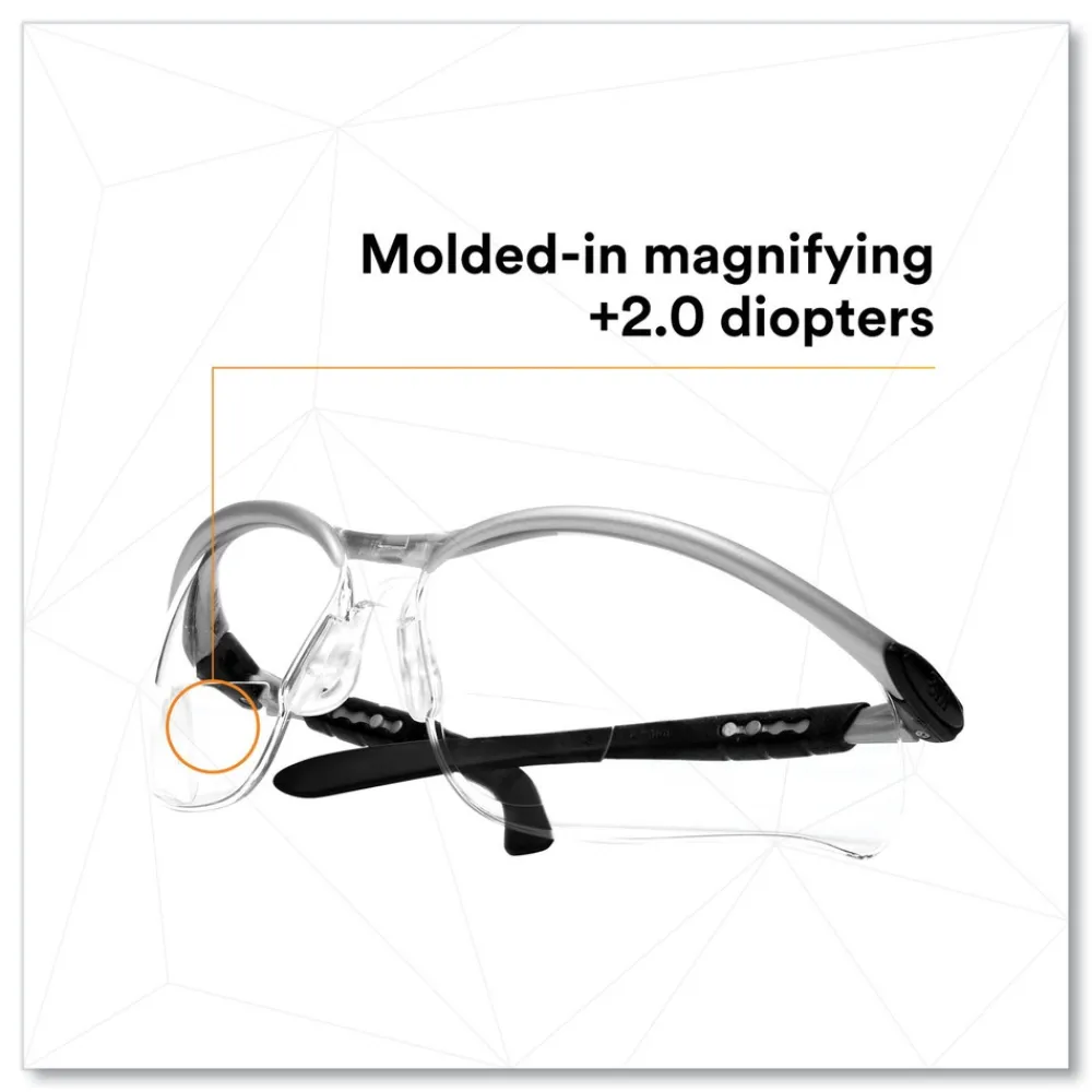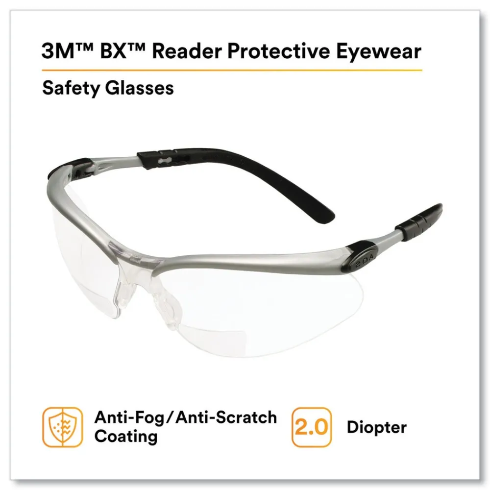 3M 11375-00000-20 BX Molded-In 2.0plus Diopter Strength Safety Glasses – Silver/Black Frame, Clear Lens