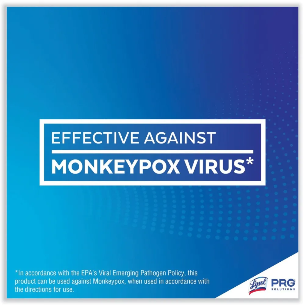 This product has demonstrated effectiveness against viruses similar to Monkeypox on hard, non-porous surfaces and in accordance with the EPA’s Viral Emerging Pathogen Policy, can be used against Monkeypox, when used in accordance with the directions for use
