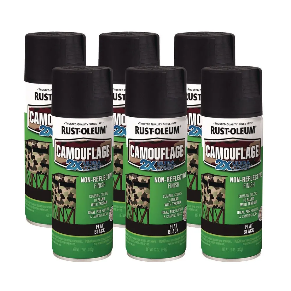 Rust-Oleum Camouflage Spray Paint provides a non-reflective, ultra flat finish for maximum hiding on interior or exterior surfaces. Fast drying camo spray paint offers quick transformation on surfaces, hunting gear, stencils and more. Camouflage Paint is ideal for sprinkler pipes, deer hunting and tree stands, outdoor wood and metal sheds, army and military-inspired vehicles, trucks and Humvees, four-wheelers, outdoor playground equipment, patio chairs, utility meters and electric boxes, fishing boats (topside only), shelves and furniture, accent walls and inside/outside structures, power tools, hunting gear and tackle boxes, paintball arenas, sports gear and scenic theatrical sets.