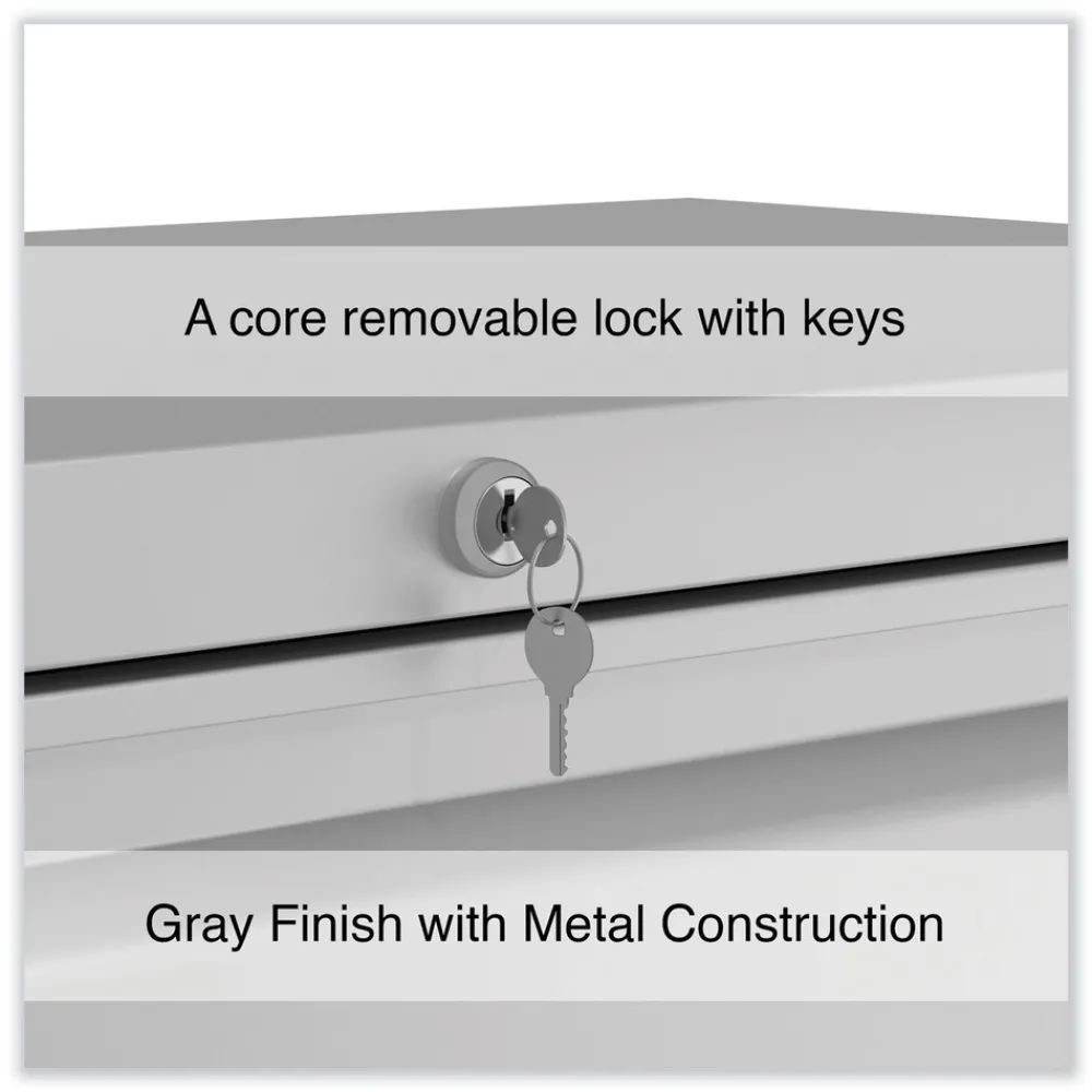Drawers with side-to-side hang rails to accommodate letter/legal hanging files. Full drawer extension on steel ball bearing telescoping slide suspension helps drawers glide with ease. Stylish, full-width radius edge recessed pulls help to quickly open and close drawers. Anti-tipping interlock system allows only one drawer to open at a time. Single key core removable lock with two keys. Four adjustable leveling glides. Durable powder coated finish helps prevent scratches.
