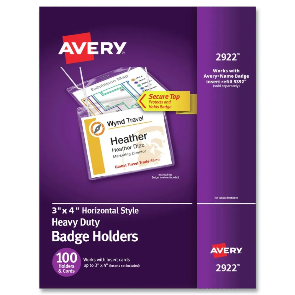 Secure design keeps badges from falling out. Heavyweight flexible plastic is ideal for permanent or temporary identification. Protect security access control cards or create name badges. Multi-use styles are pre-punched to accommodate lanyards and reel clips. Use with Avery Name Badge Inserts (5390 and 5392). Easy to customize with free templates and designs using Avery Design and Print online.