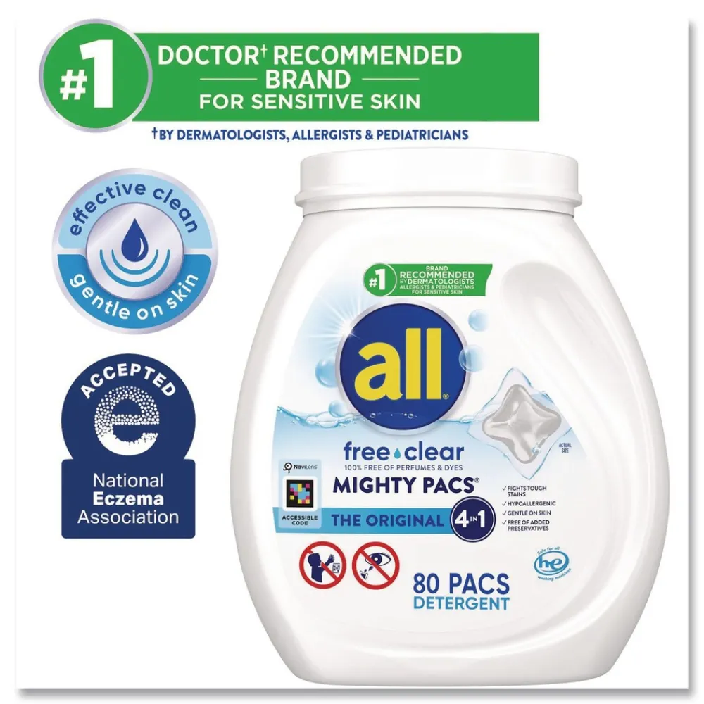 One hundred percent free of perfumes and dyes with concentrated cleaning power in a convenient pod. all Free Clear is the #1 recommended detergent brand by dermatologists, allergists and pediatricians for sensitive skin. These hypoallergenic pods are tough on stains, gentle on skin. Use with all Free Clear fabric softener and dryer sheets for clean and soft clothes with static cling reduction in the dryer. These pods are unscented, fragrance free and are safe to use in any washing machine including high efficiency (HE). They dissolve completely even in cold water. Add pods to washing machine drum before adding clothes. Use one pod for small and medium loads or two pods for larger loads, then wash as usual. Safe for septic systems and contain no phosphates.