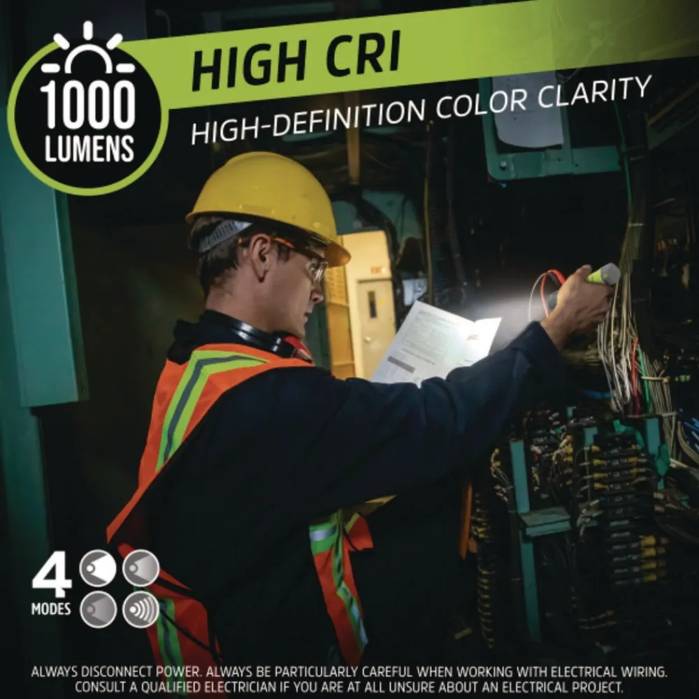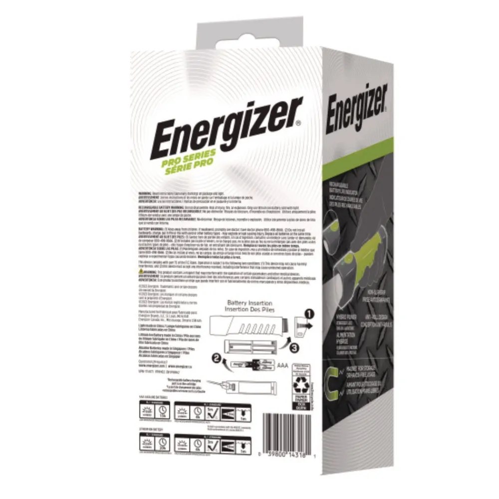 Energizer Hybrid Pro Series Handheld High CRI Flashlight maximizes your performance and durability to meet the tough standards and demands of your job. This handheld flashlight features powerful LED technology with High CRI for high-definition color clarity to enhance your safety with increased visibility. You can power up this hybrid flashlight with 6 AAA batteries (included) or recharge via USB (charging cable included). With 1,000 lumens, this LED light offers intense lighting and has a beam distance spanning nearly 1.5 stadium fields. Durable, waterproof and dustproof, this flashlight withstands demanding conditions. The anti-roll design and magnet attachment provide a steady base for hands-free operation or storage. It also features a large push-button switch that is easy to use with gloves on and a non-slip grip for easy carry. Plus, a pouch is included to attach to your belt while easily storing your light, batteries, cartridges and charging cable all in one place. Colorful, the green color lets you easily find this bright flashlight in your toolbox. It’s recommended to use this durable LED flashlight in emergency situations or as a work flashlight. Trust in Energizer to deliver the powerful performance we promise Energizer lights are tested and adhere to strict, reliable ANSI standards.