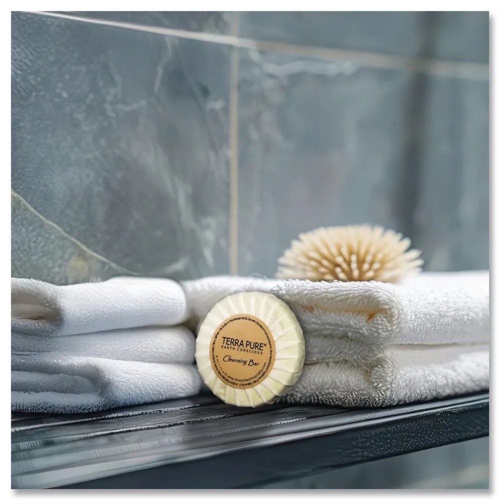 The luxurious Terra Pure cleansing bar features a subtle, refreshing green tea fragrance that gently soothes and uplifts the senses. Carefully formulated with nourishing olive oil and aloe vera extract, the cleansing soap bar provides a calming, hydrating cleanse suitable for all skin types. Our vegan-friendly, sulfate-free formula makes it a responsible choice for any hospitality setting. Thoughtfully wrapped in an elegant tissue pleat, it offers a refined presentation that enhances any guest bathroom. An EcoWell Health and Wellbeing group product, it is 100 percent paraben-free, gluten-free and cruelty-free; never tested on animals. The Terra Pure cleansing bar reflects a strong commitment to wellness, sustainability and ethical standards without compromising on luxury. Designed for today’s discerning guests, Terra Pure helps create a memorable, spa-like experience with every stay.