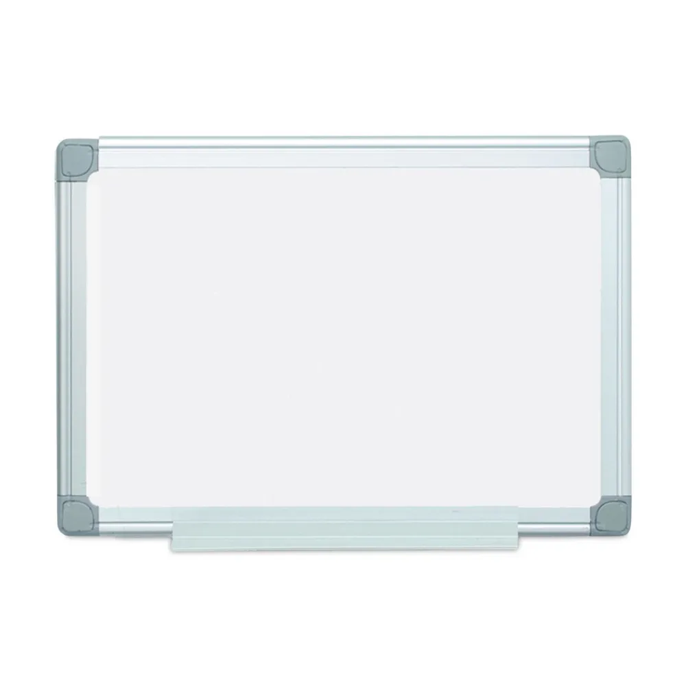 MasterVision Earth Silver Easy Clean Dry Erase Boards are a solution that combine superior writing and cleaning performance with professional Maya frame quality. Made from recycled and recyclable materials, these non-magnetic boards are double-sided to provide twice the life of standard melamine whiteboards. Both board surfaces are suitable for moderate use and can easily be flipped when necessary. Four-corner system allows for both vertical and horizontal mounting, offering versatility when reconfiguring an office and where wall space might be limited. An adjustable accessory rail offers a convenient way to keep your markers within easy reach. Sturdy, heavy-gauge aluminum frame.