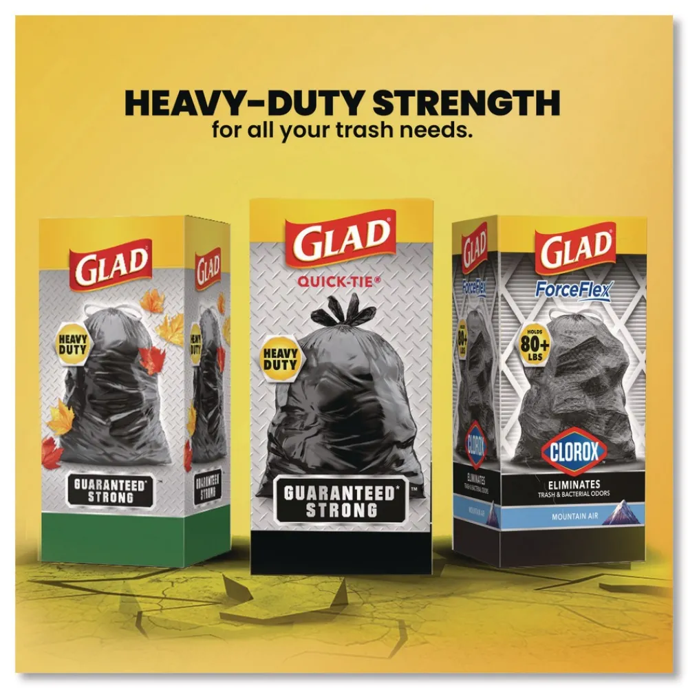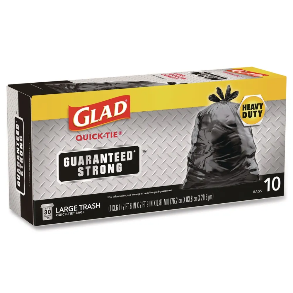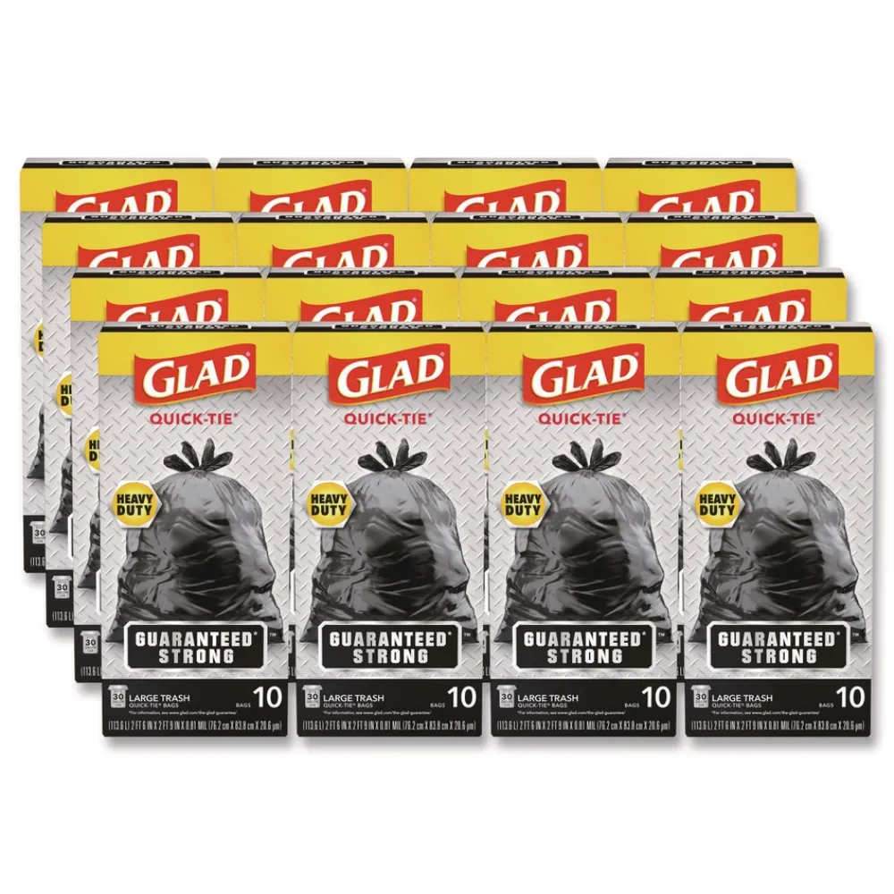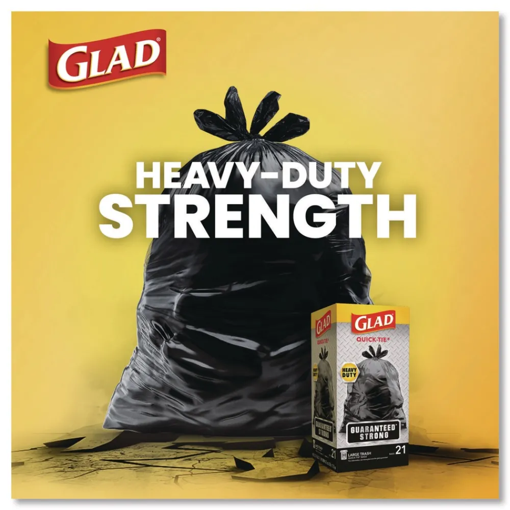 Glad Strong Quick-Tie Large Trash Bags with 3-ply strength help protect your home or office from garbage disasters. The strong and dependable Quick-Tie flaps allow you to close the bag by cross-tying the flaps to keep the bag securely shut. No need for inconvenient twist-tie. They are also easy to lift and carry, so you can transport even the fullest bag with ease. These sturdy bags are fantastic for heavy volume and heavy loads. Great for outdoor or garage use. Ideal for use in schools, daycare centers, restaurants, hotels and other commercial facilities.
