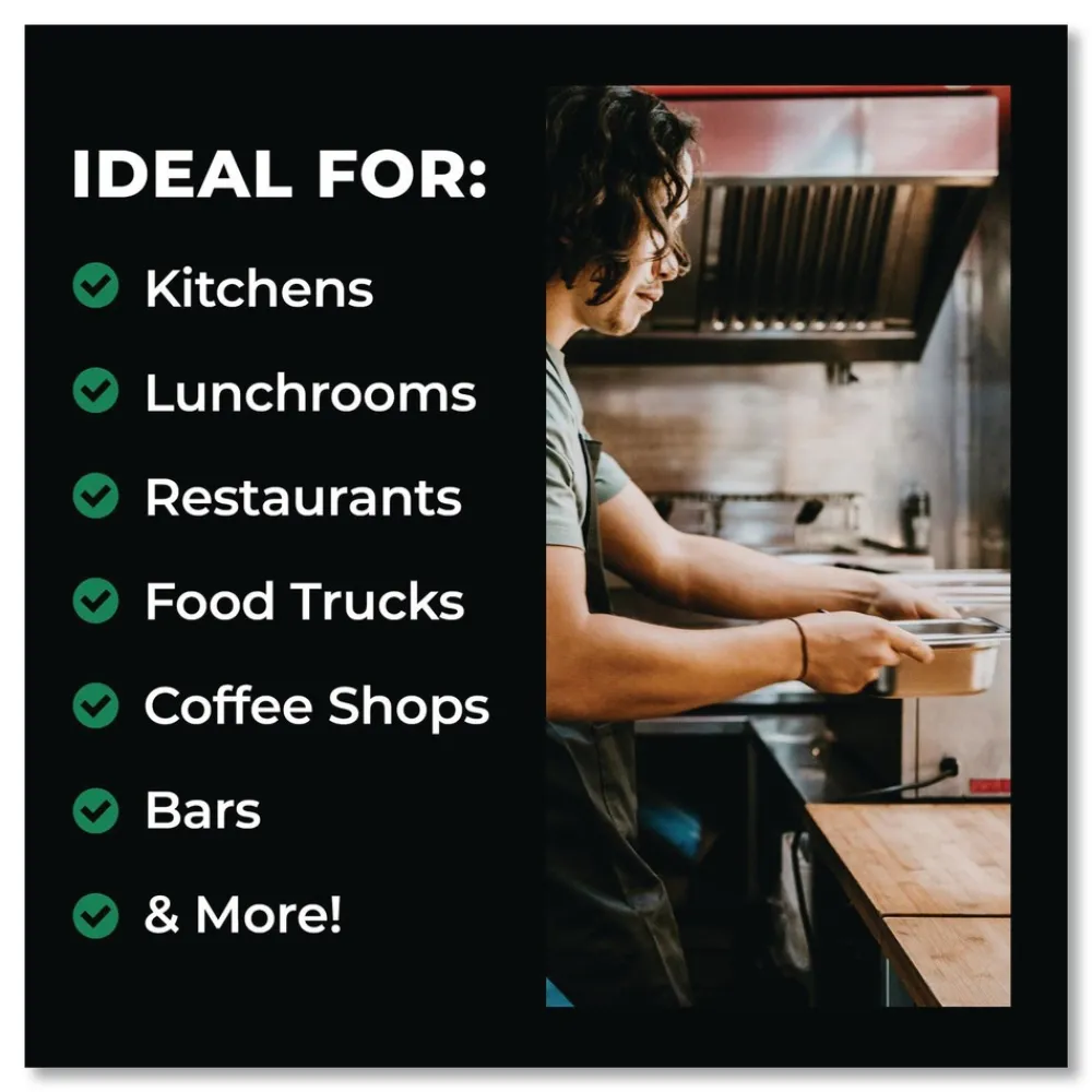 Ideal for use in food service such as restaurants, bars, cafeterias, food trucks, commercial kitchens, bakeries, coffee shops, lunchrooms and more