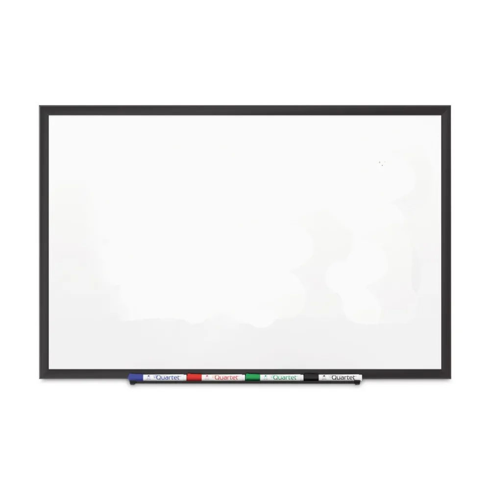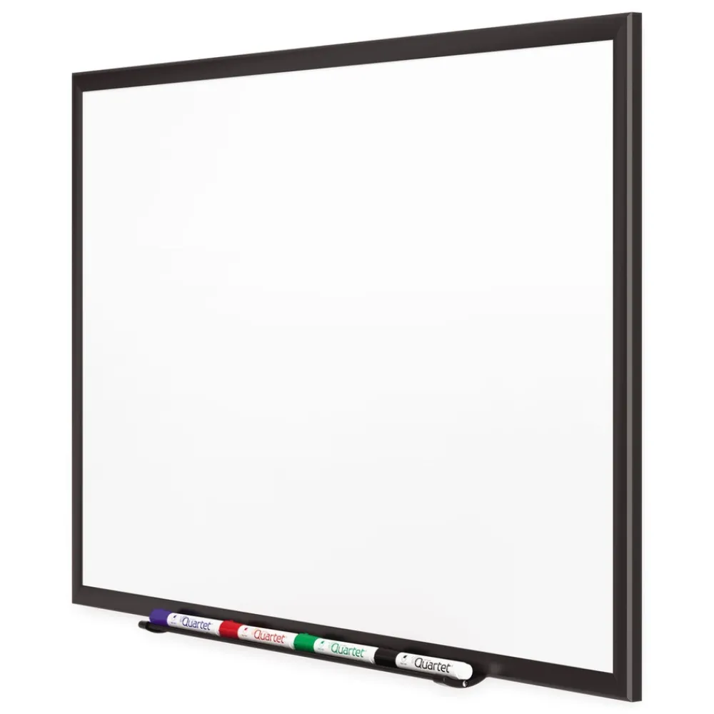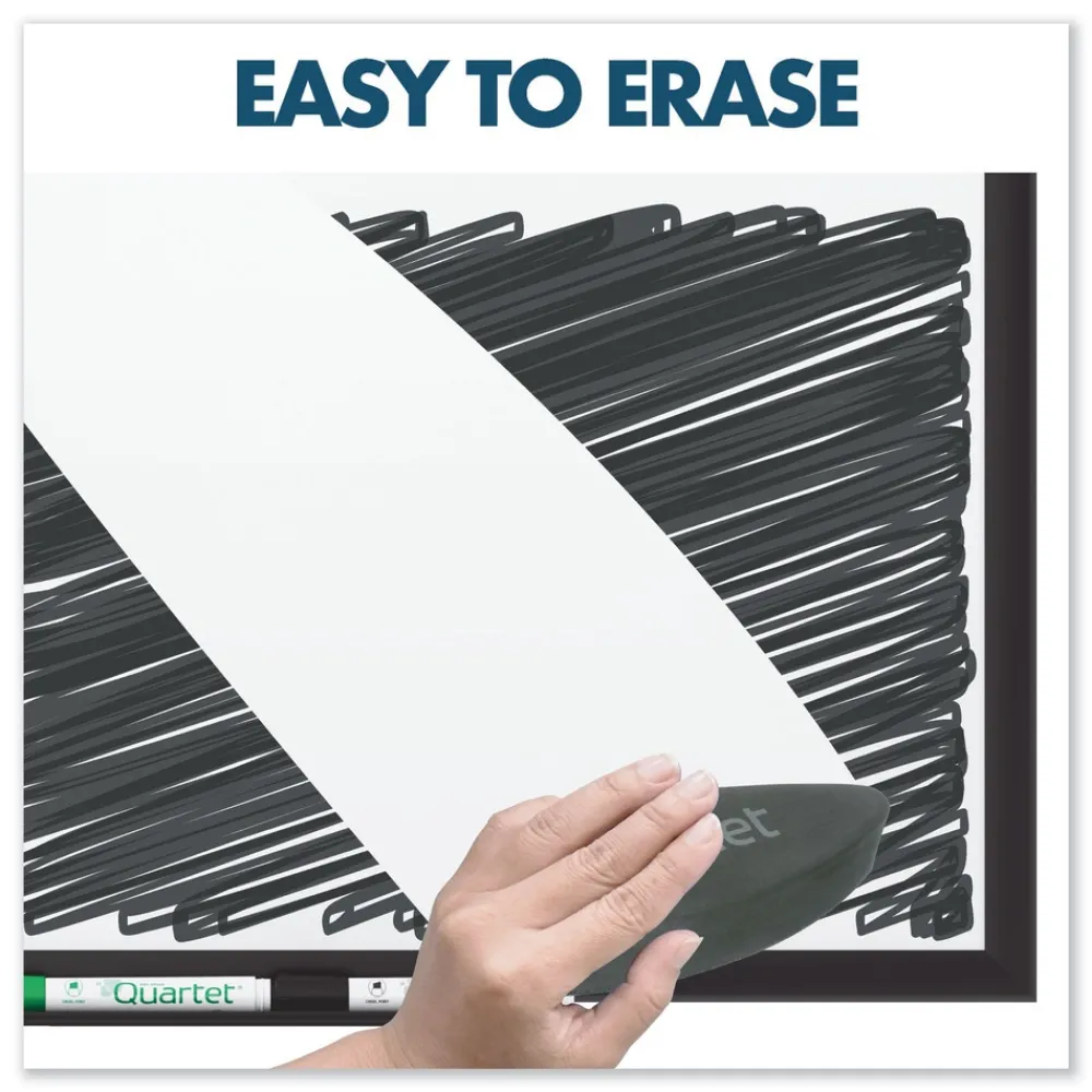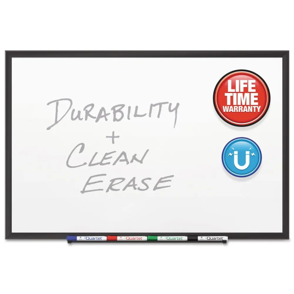 Durable, ultra-smooth board with DuraMax porcelain surface will not scratch, dent, stain or ghost. Delivers superior performance when collaboration is needed in high-profile, heavy-use office environments. Magnetic surface doubles as bulletin board. Easy-to-clean writing surface requires minimal use of Quartet cleaning solutions. Unique mounting system, quickly and easily secures board to wall. Stylish frame complements high-profile interiors. Includes four Quartet dry-erase markers.