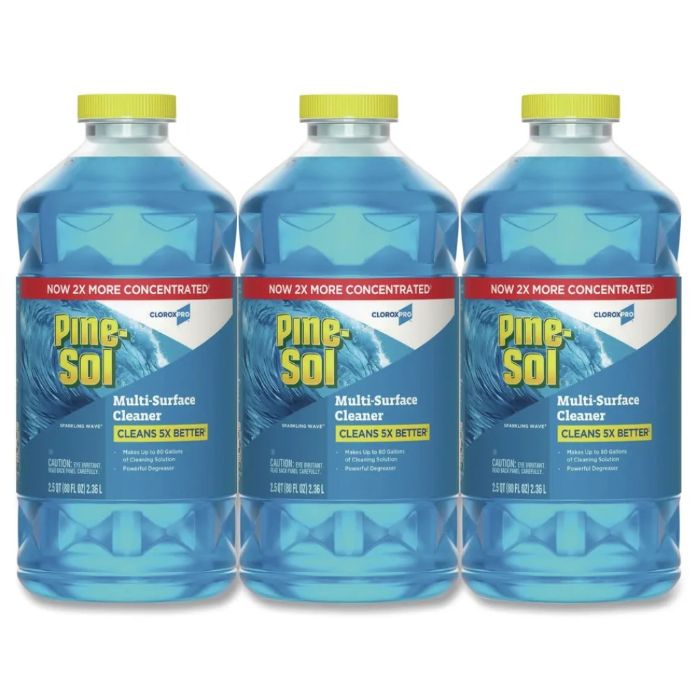 With Pine-Sol Multi-Surface Cleaner from CloroxPro, you only need one cleaner to fight tough dirt, grease and grime. This 2X concentrated formula delivers more cleaning power per drop and cleans 5X better than the previous Pine-Sol scented formula. Easier to handle and easier to store, the space saving bottle size gives you more cleaning solution in a smaller bottle made of 30% less plastic. This multipurpose cleaner cleans right the first time, removing stains and deodorizing soft surfaces while leaving a clean scent. This powerful degreaser cuts through grime and soap scum fast and is safe for use on wood, tile, stone, porcelain, and glass and more when used as directed on hard nonporous surfaces. Do not use on marble, aluminum, copper or wood that is unfinished, unsealed, unpainted, waxed, oiled or worn.