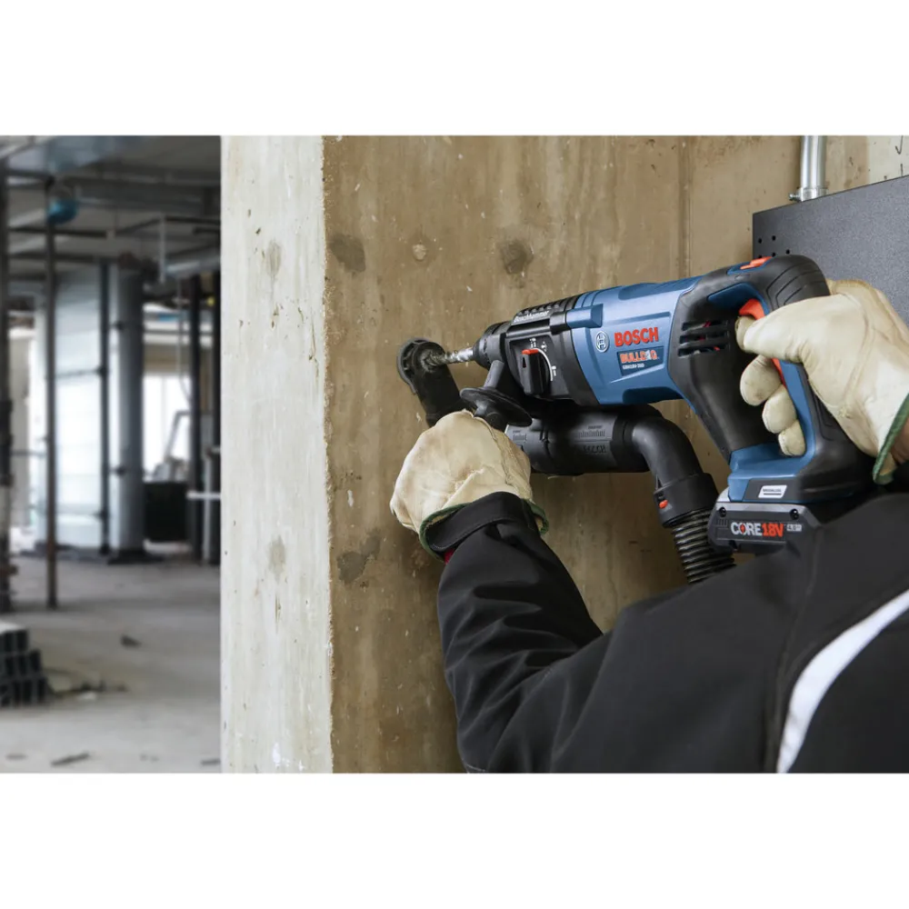 This Bosch D-handle Bulldog hammer consistently outperforms the best-selling 1 in. corded 11255VSR Bulldog, making it better than the best. The GBH18V-26DK15-RT 18V EC Brushless 1 in. SDS-Plus Bulldog Rotary Hammer Kit features a hammer that delivers 1.9 ft-lbs. of impact energy, based on the industry standard of measurement agreed upon by the European Power Tool Association (EPTA). It weighs only 5.8 lbs. (tool only, not including battery), delivering superior performance and an outstanding impact-to-weight ratio. The kit features a CORE18V battery, which has Next-Gen Li-Ion 21700 cell technology for extended performance in lightweight, high-power battery. The EC Brushless motor maximizes battery runtime for extended performance. The tool features a jobsite-proven D-handle design with soft-grip and is ideal for both overhead, horizontal and downward drilling applications. It also has KickBack Control, an integrated sensor to stop tool rotation in bind-up situations. This tool is compatible with an optional GDE18V-26D cordless dust-extraction unit, delivering a self-contained HEPA dust solution for max mobility. The hammer features a variable-speed reversing trigger for accurate bit starting.