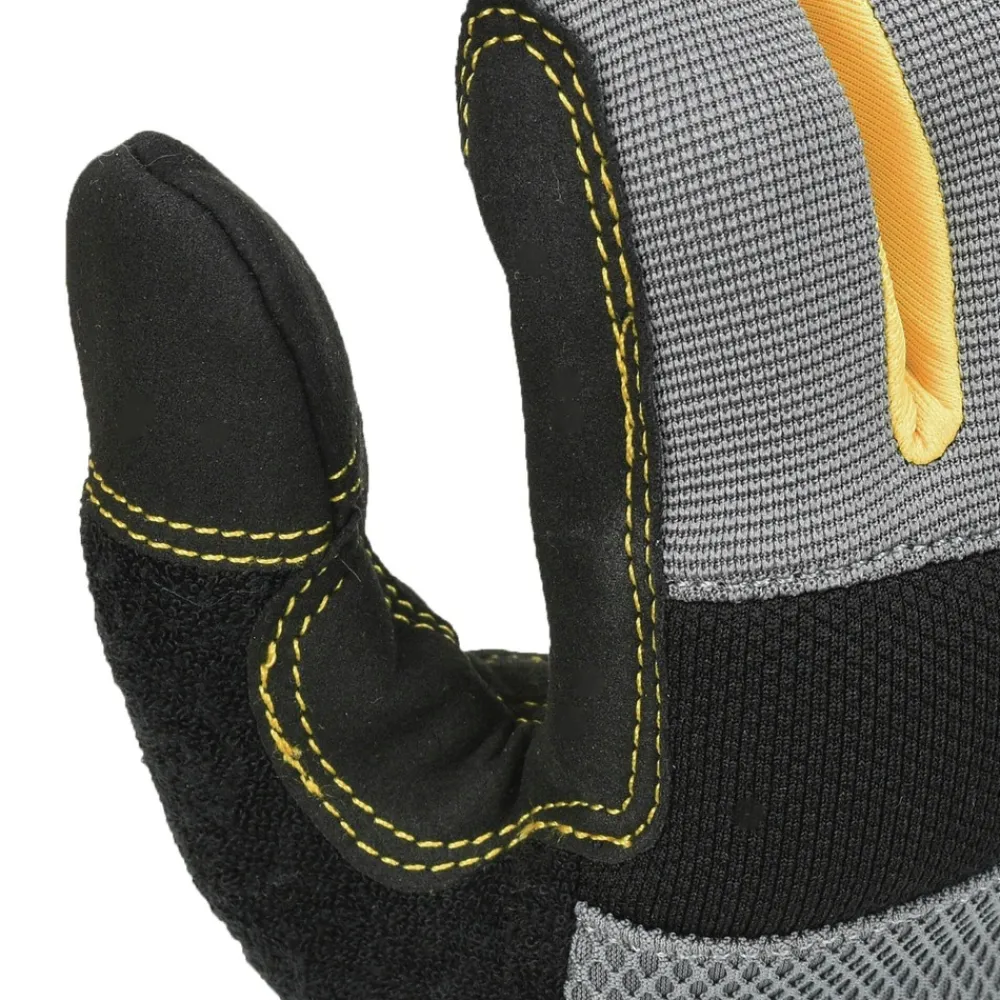 The DEWALT DPG211 Foam Padded Performance Glove protects against hand fatigue when working on jobs such as machinery repair, wooden structure installation, or digging through gravel and rock. Foam padding on palms and knuckles cushions hands from tool use, while synthetic leather fingertip overlays provide a strong grip and abrasion resistance. Double stitching and thumb saddle provides added durability.