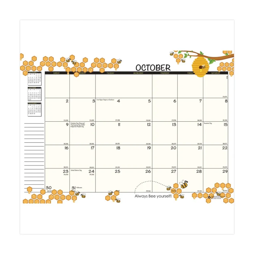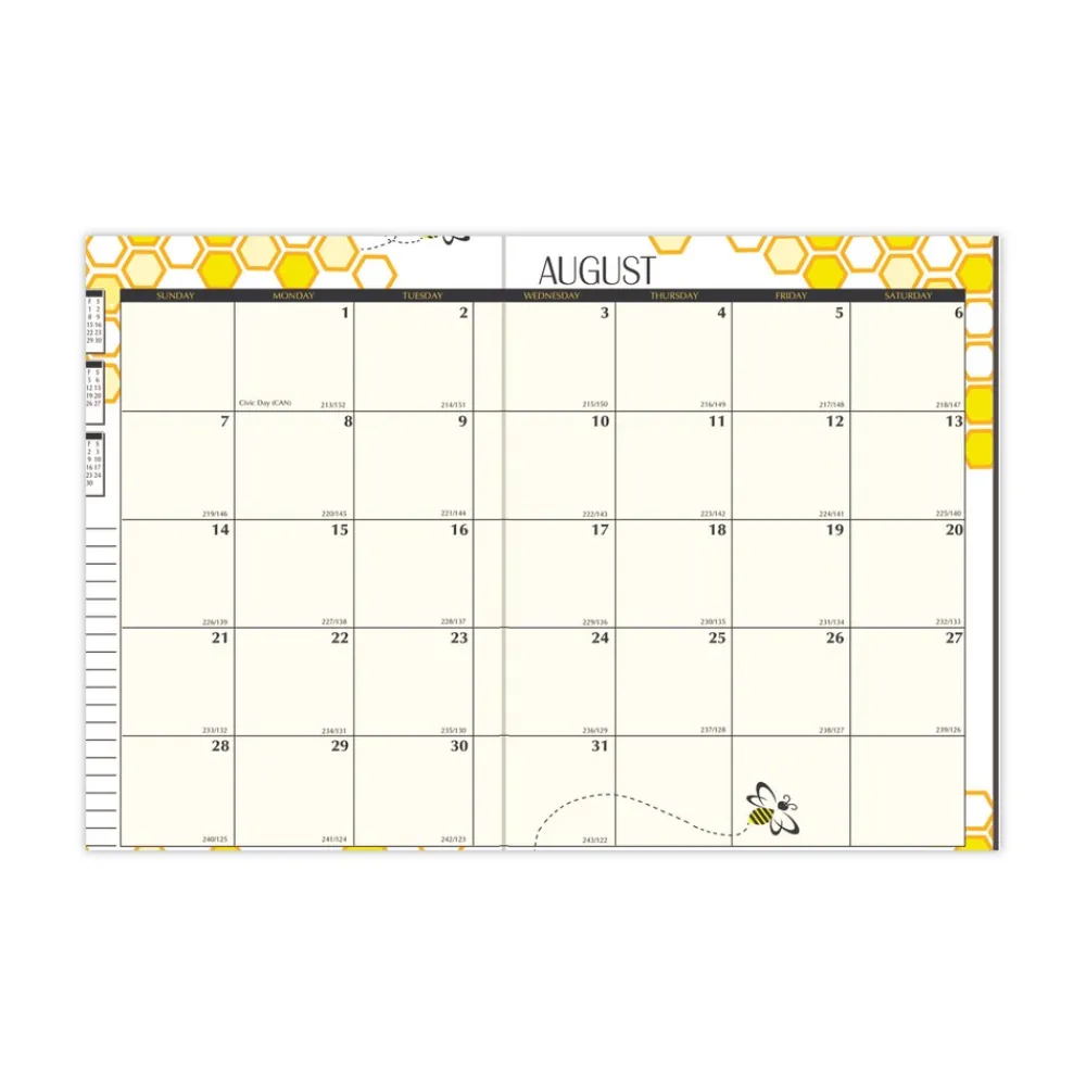 House of Doolittle 100 percent Recycled Honeycomb Academic Monthly Planner, featuring August to July, has an adorable Bee Happy honeycomb design that rotates every six months, one month per two-page spread. This 7stitched flat planner fits well in any case or backpack. Includes space for important note information, Julian dates/days, previous, current and next month reference calendars with special bee phrases each month. The black leatherette stitched cover displays a honeycomb and bee pattern also. Additional information pages include important dates and holidays and a three-year at a glance calendar.