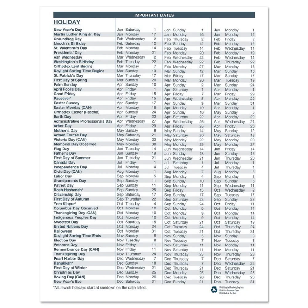 Stitched-book-style flat planner, with room to record necessary appointments and general information, is ideal for the busy professional. One-month per two-page spread with generous note space for important information. Lightly ruled daily blocks help keep notations neat. Includes numbered weeks. Additional information sections include important holiday dates, a three-year reference calendar and a lined contact-information page. Made entirely of recycled materials.
