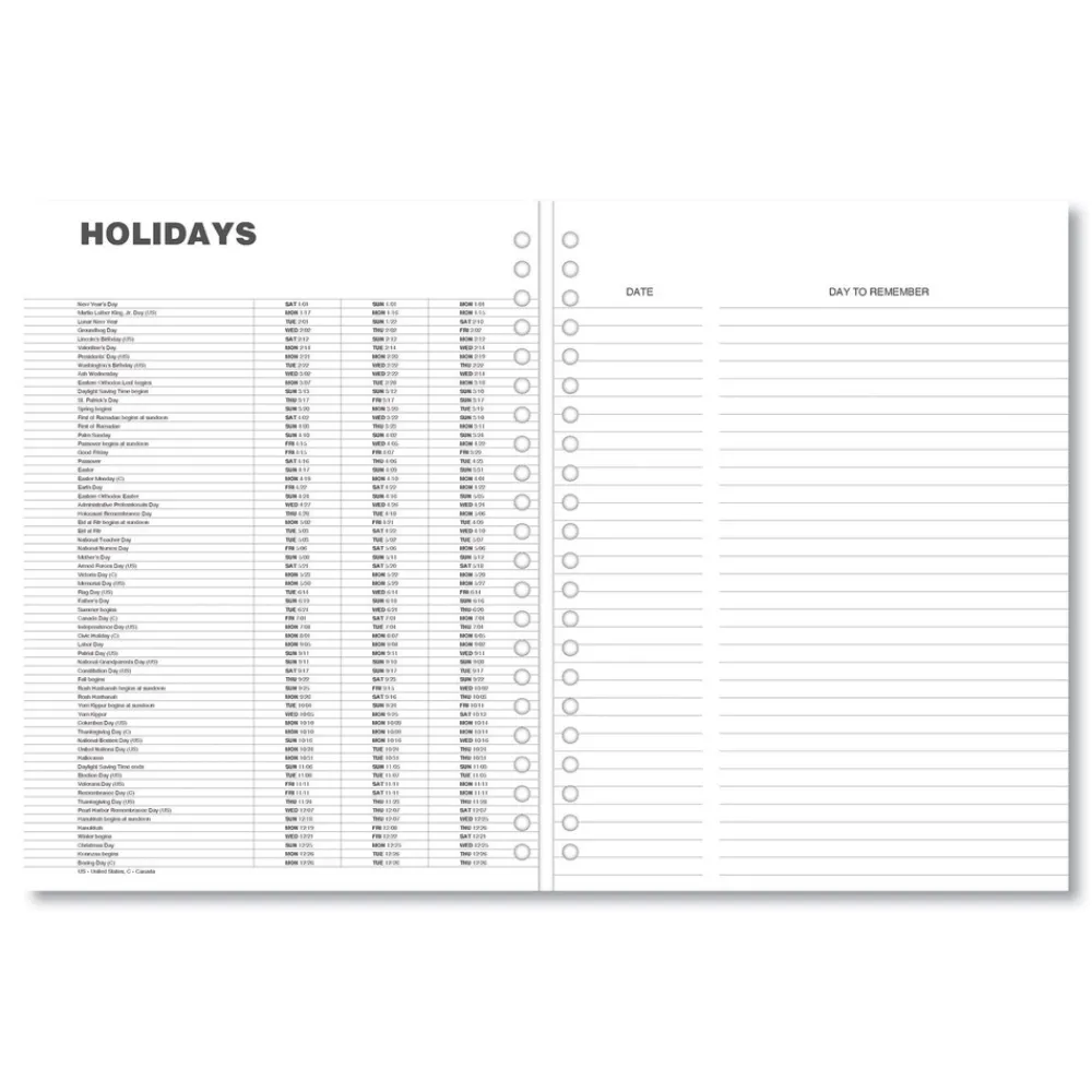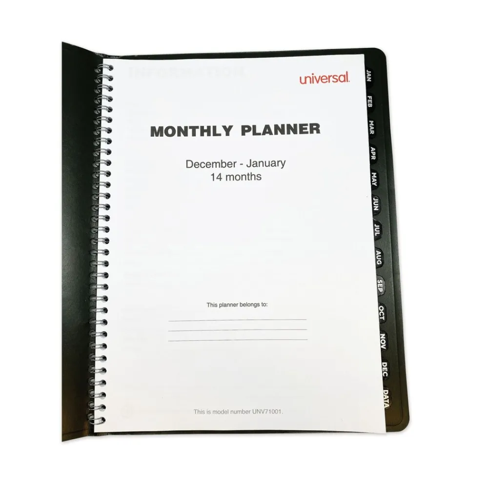 Get your schedule planned out with this Universal large 14-month monthly planner. This versatile notebook features dates to remember, three-year reference, holiday list and notes pages to help coordinate plans. Monthly planner displays one month per two-page spread with unruled daily blocks, so there’s plenty of space for writing and has a faux leather cover to provide a professional appearance.