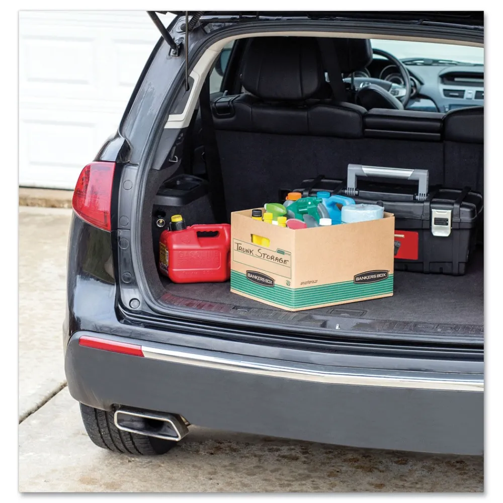 Bankers Box Recycled Stor/File Box has double-end, single-side construction. Medium-duty for use with or without shelving. FastFold quick and easy assembly. Deep, locking, lift-off lid stays in place for secure file storage. Perfect for storing important home or office papers and other items that you need to keep organized for future use. Made from recycled corrugated cardboard. Perfect for use in the office, home office, school, or wherever you need to store important papers, documents or important items.