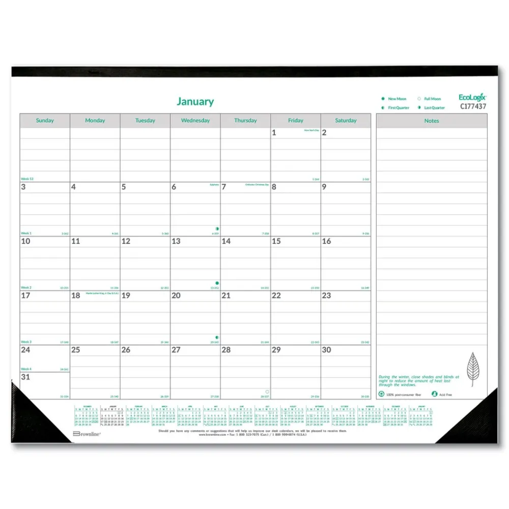 Brownline C177437 12-Month (Jan-Dec): 2026 22 in. x 17 in. EcoLogix Artwork Monthly Desk Pad Calendar – White/Green Sheets, Black Binding/Corners