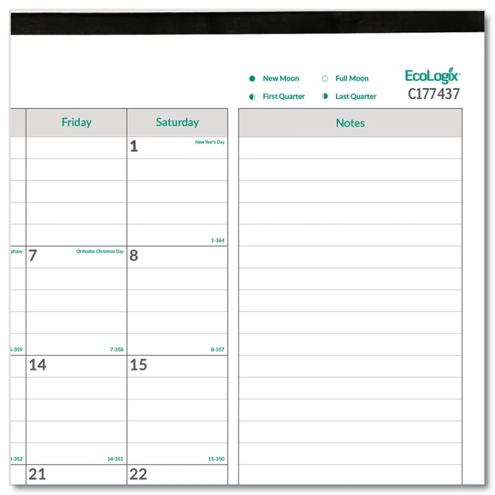 Designed with the future in mind with an eco-friendly tip each month. Ruled daily blocks, note space and a full-year reference calendar for future planning. Perforated sheets for easy removal. 100 percent post-consumer recycled paper.