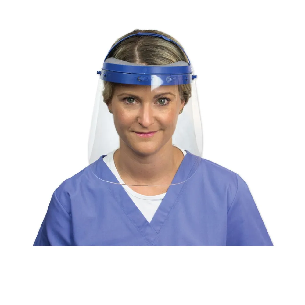 Fully assembled, full length face shield with headgear was engineered to help protect the eyes, nose and mouth and provide an additional barrier with other PPE products. Fully assembled with two adjustable bands that provide a secure fit, while the foam across the forehead adds comfort for extended wear. Can be worn with or without safety glasses, as well as a mouth covering, while still maintaining a lightweight and comfortable fit. Latex-free. Ideal product to be worn as added face protection where maximum face protection is the goal.