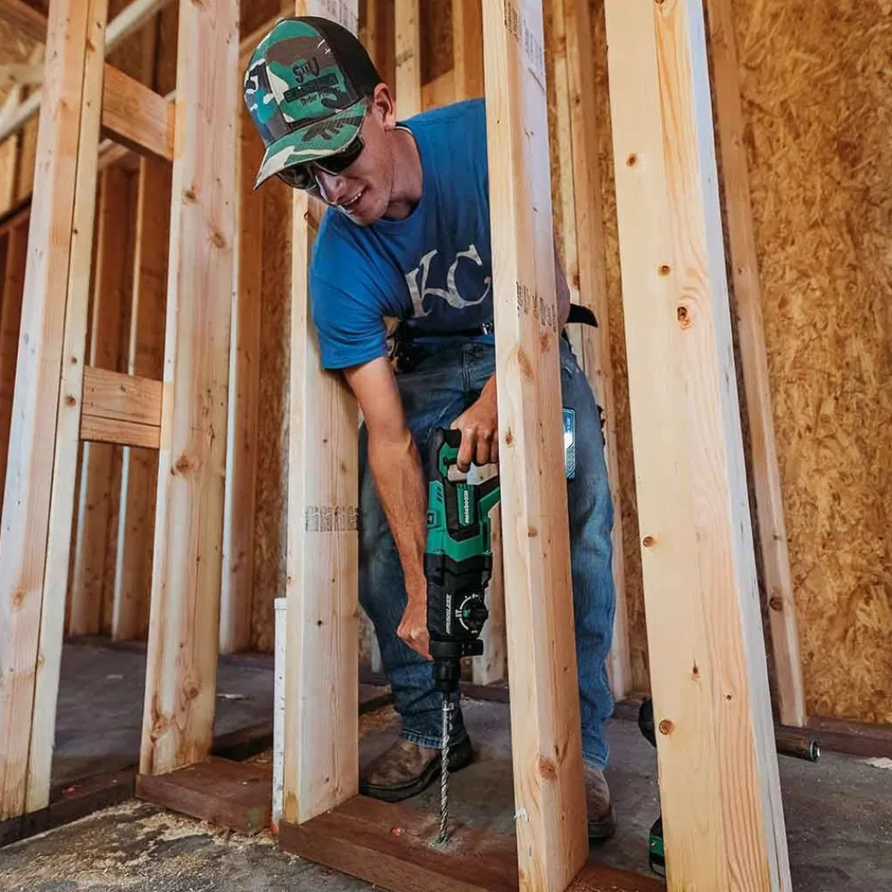 The 36V MultiVolt Brushless SDS-Plus 1-1/8 in. Rotary Hammer (DH3628DD) offers corded performance with the convenience and versatility of a cordless tool. Go all day as its D-Handle ergonomic design makes drilling easier, especially for overhead and downward drilling. Work more efficiently with the auto stop feature that allows you to set times for repetitive drilling. Control you power with its 2-speed setting function. Work safely as the Reactive Force Control (RFC) stops the motor before the entire tool jerks if the tool bit is suddenly overburdened during operation. Work cleaner and safer with the optional dust extractor (#376971M). The DH3628DD 36V Brushless SDS-Plus 1-1/8 in. D-Handle Rotary Hammer is part of the expanding MultiVolt System of power tools from Metabo HPT. It accepts any MultiVolt battery for extreme power and runtime and can also accept the unique AC Adapter (ET36A) to plug in for all day runtime, offering ultimate versatility and power on the go. Also available as tool body only model (DH3628DDQ4).