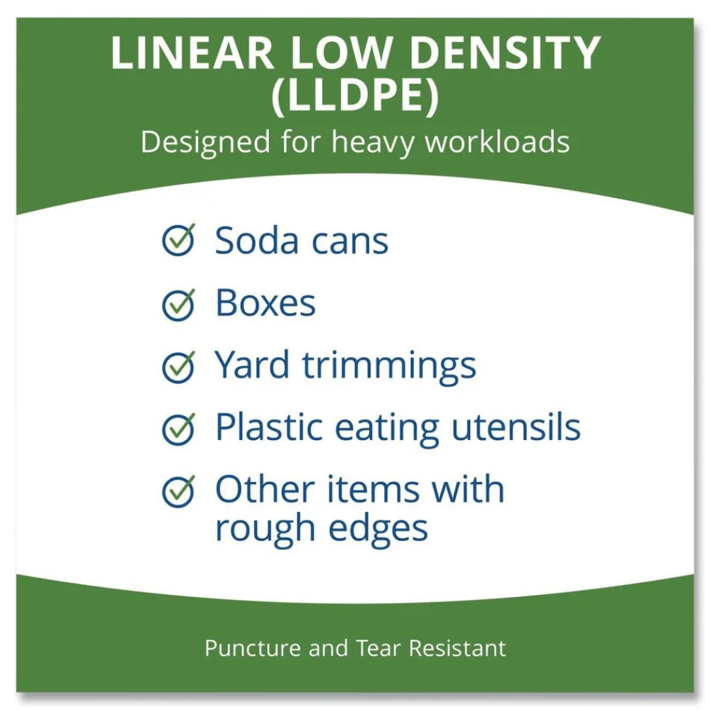 Multiuse, strong, low-density recycled plastic bags provide maximum puncture and tear resistance. Lab tested for strength and reliability to recommended weight capacity. Designed for use in specified gallon-capacity containers. Perfect for home, office and industrial use.