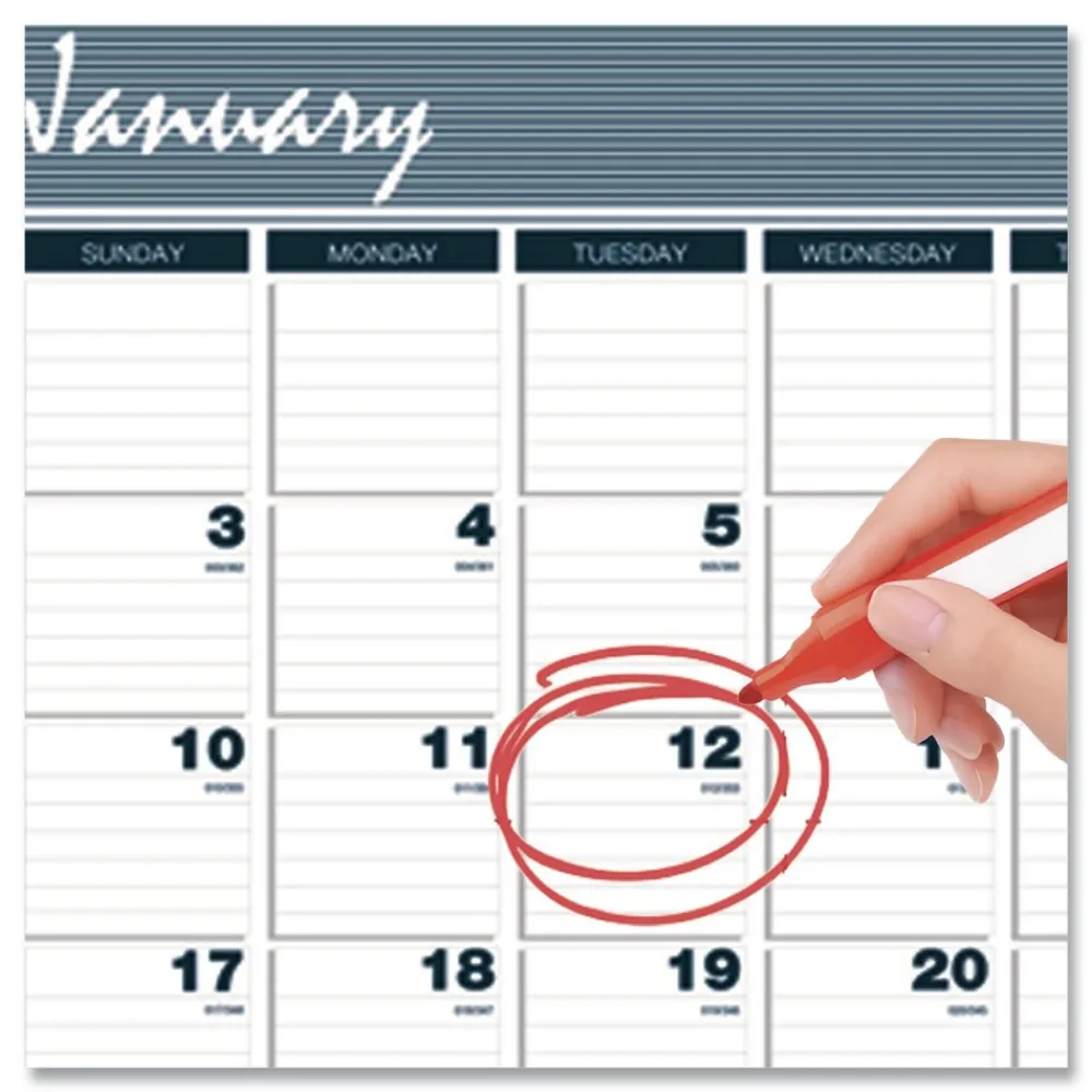 Ruled daily blocks keep notations neat. Full-year reference calendar aids in planning throughout the year. Neutral graphics match any decor. Wirebound with a full chipboard backer and a sturdy wire hanger. Made entirely of recycled materials.