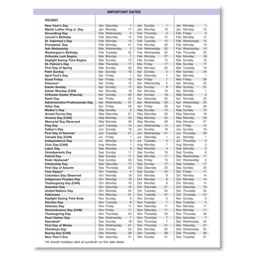 Additional page with important holiday dates for three years in list form as well as, three-year calendar reference page for long-range planning.