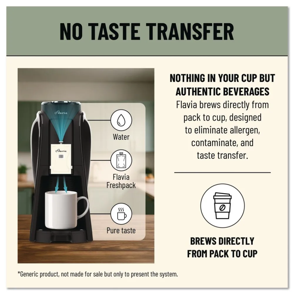 Enjoy your favorite coffees, teas, cappuccinos, lattes, and hot chocolate with the FLAVIA AROMA. Brewing is simple! Choose from a variety of drinks, and in under a minute, you’ll craft your custom beverage with just a push of a button. Perfect for any small office or supplementary spaces such as conference rooms, meeting spaces and more, the Flavia AROMA brewer offers a full range of cafe-style drinks in a small and compact countertop design for any office space. Brew coffees, teas, cappuccinos, lattes, and hot chocolate in three sizes, all ready in less than a minute. With no cleanup or mess and an easy-to-fill water tank, you can enjoy all your favorite custom beverages with just a push of a button. Automatic shut-off.