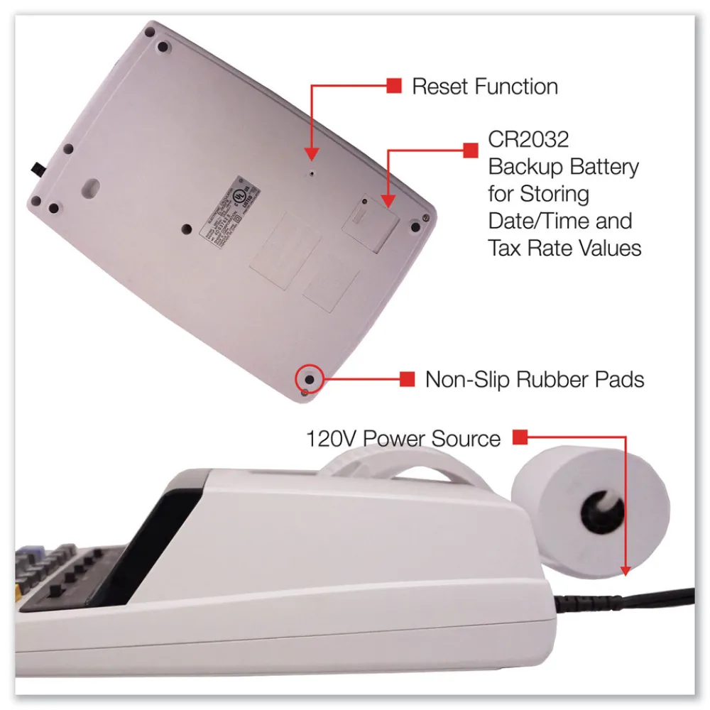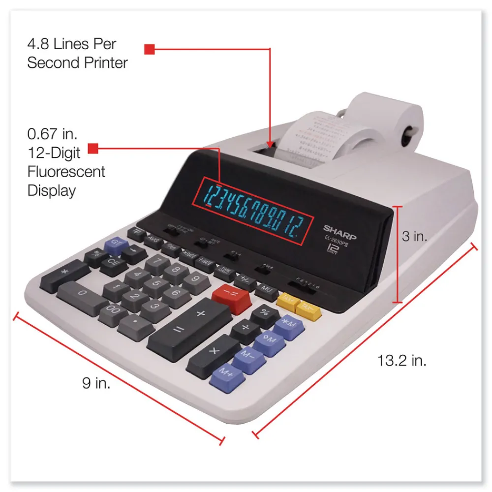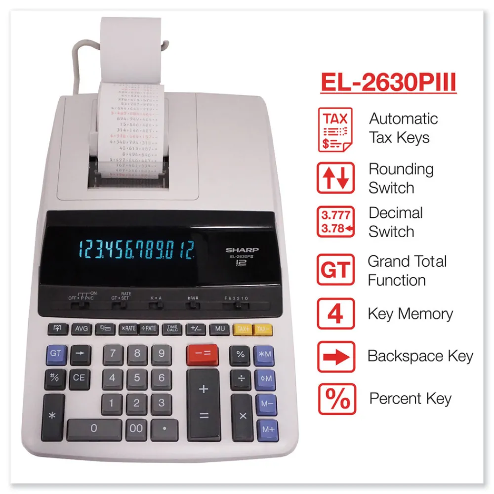 Whether in an office setting or at home, the EL2630PIII is the perfect 12-digit printing calculator for the occasional user. The extra-large display makes for easy viewing. Engineered with a Microban antimicrobial agent that reduces the growth of microbes and bacteria on the keys that cause discoloration and odors. You will always be able to count on the fast and reliable 4.8 lines-per-second ribbon printer. Other functions include: mark up key for calculating cost-sell-margin calculations, percent changes, automatic add-on/discounts calculations, automatic tax keys, clock/calendar function, conversion function, constants in multiplication and division, grand total key, change sign key, large-size add and subtract keys, fully selectable decimal settings, date/non-add key, item count, average key, selectable rounding switches and four key independent memory. AC power.