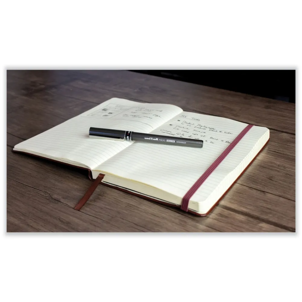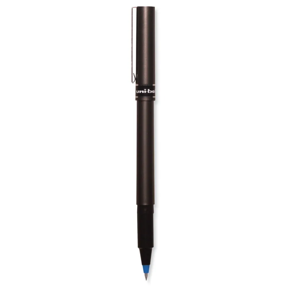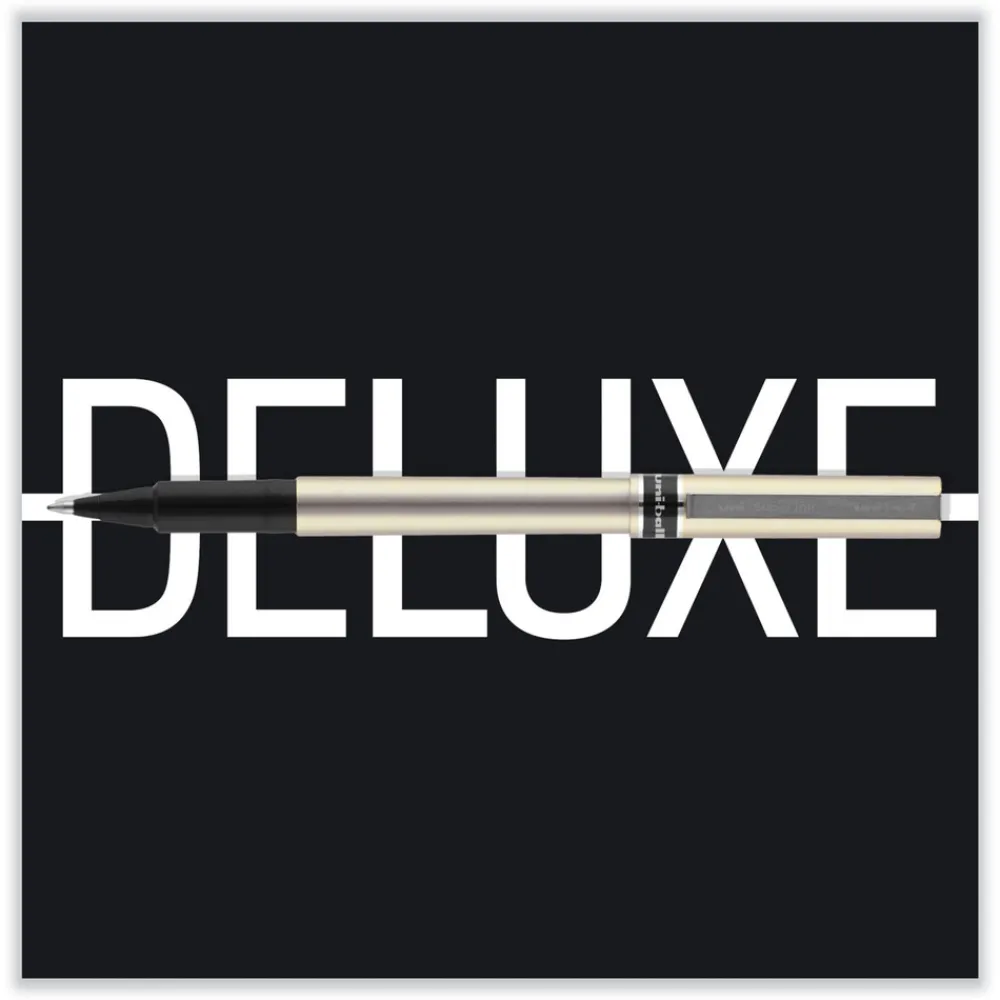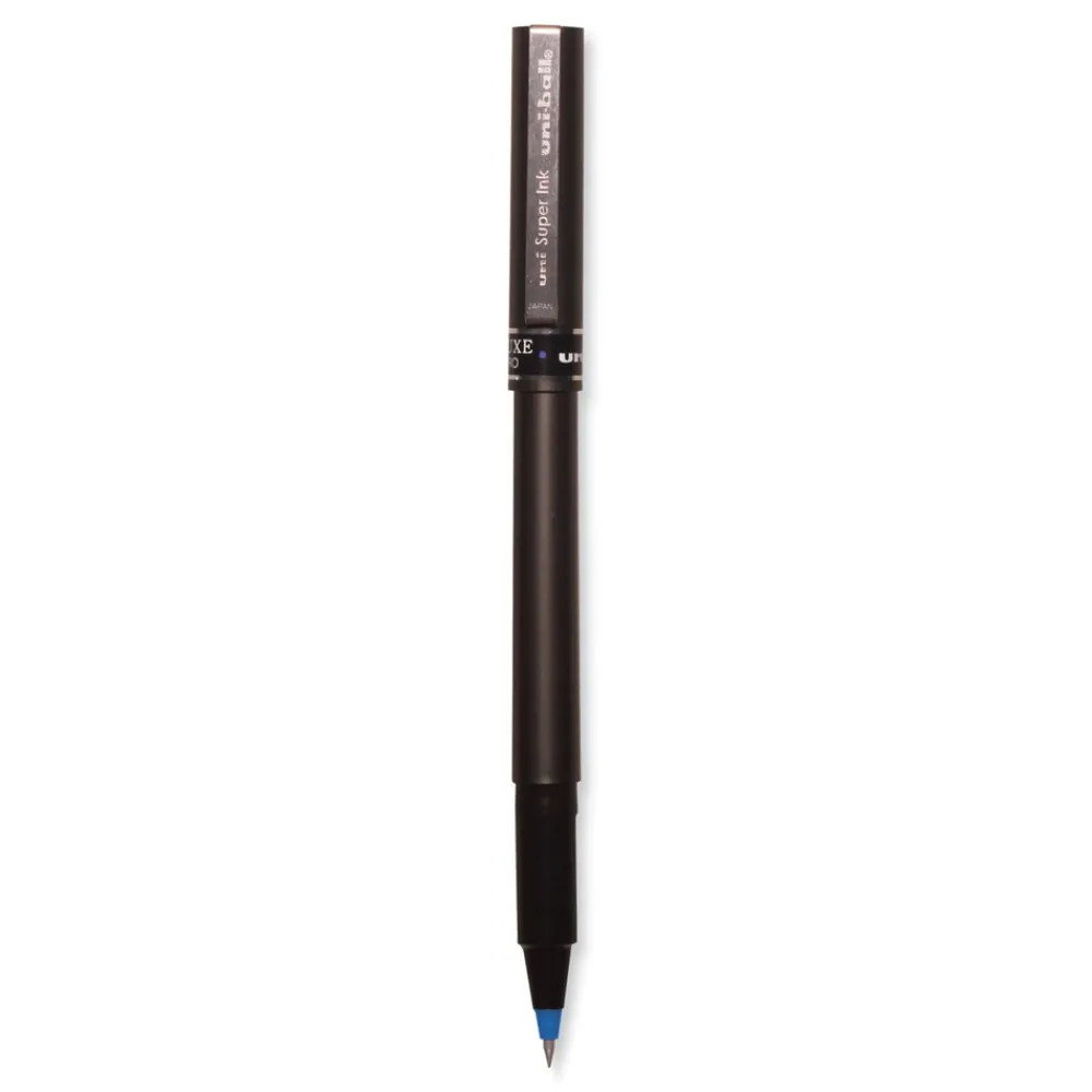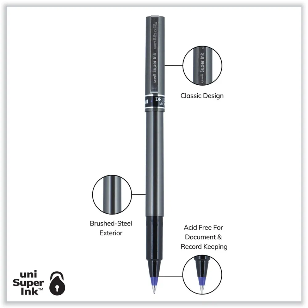 Introduce sophisticated style to your everyday writing with Deluxe Rollerball Stick Pens from uni-ball featuring a strong, long lasting tip. Even-flowing, acid-free liquid ink delivers a smooth writing experience for intense, vibrant lines. Deluxe delivers crisp lines with unparalleled definition, making it easy to create super fine details in your drawings and diagrams. Capped roller pens are useful for a variety of tasks from note taking and list making to signing checks and legal documents. Innovative uni Super Ink technology forms a strong bond with the paper, protecting from water, fading and fraud. Up your writing instrument sophistication with the matte black, brushed steel barrel of the Deluxe capped rollerball pens.