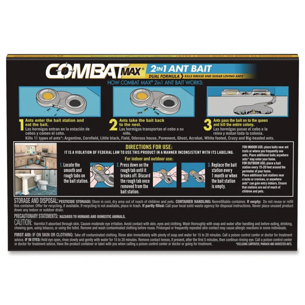 Combat Max 2-in-1 Ant Bait is formulated to attract ants quickly, acting as a necessary food and water supply for ants. Provides control of ants in as little as three to five days. This product is formulated to effectively control ants and uses two bait forms in a solid and gel. This product contains Fipronil, as its active ingredient. Its speed is slow enough for foraging ants to return to the colony/nest and feed the bait to larvae and queen so that the entire colony/nest is killed.