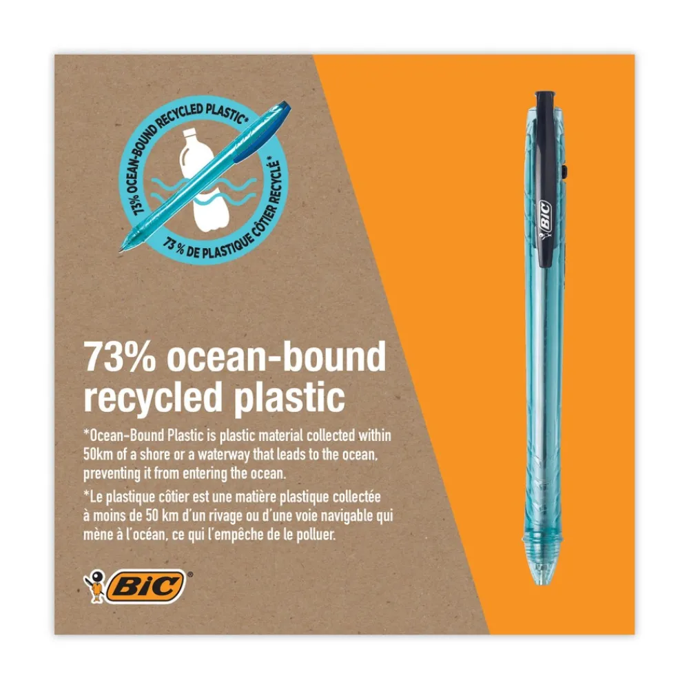 Retractable BIC ReVolution Ocean Bound ballpoint pen features a barrel made of ocean-bound recycled plastic. Packaging is also made entirely of recycled materials. This long-lasting, smooth writing pen is suited for many uses, from jotting down notes to drawing in the margins of your notebook. Once you run out of ink, no need to throw the pen away! Ink refills are available to extend this pen’s life. Join the BIC ReVolution and help write our future together.
