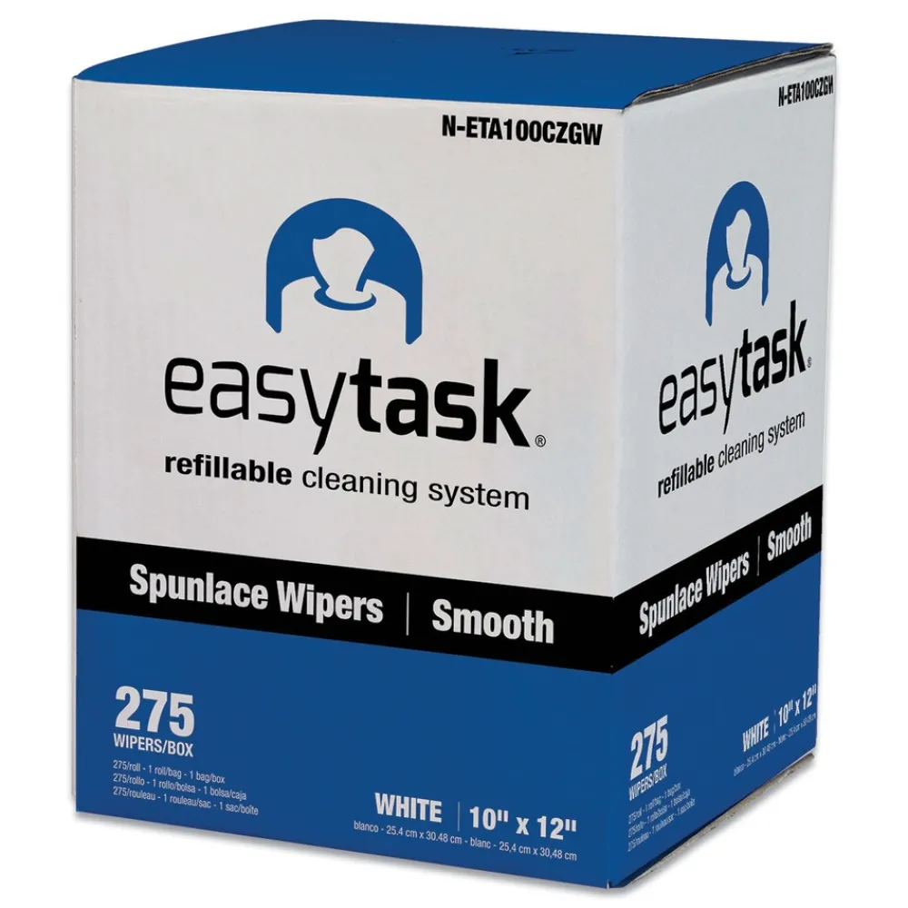 Easytask Refillable Cleaning System, create your own pre-sat wiper. Portable GrabBox contains centerpull roll in a resealable bag. Sanitizer/disinfectant compatible, holds half gallon of solution. Spunlace wiper offers excellent absorbency. Maximum strength, no lint, no binders and solvent resistant for general purpose wiping. Refill for the GrabBox or other delivery system.