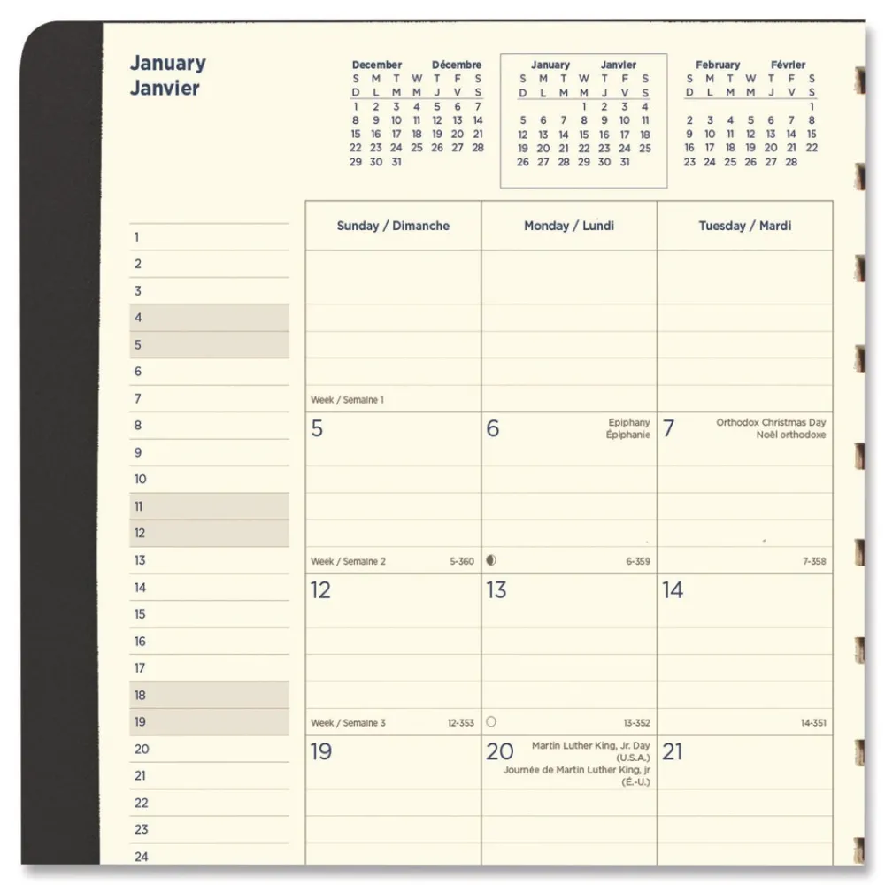 Planner features a beautiful soft touch leather-look cover with twin-wire binding and an elastic closure with piping detail. One month per two-page spread. Includes cream-colored, fountain-pen-friendly paper, a ruler/page-marker, 40 repositionable note pages and one moveable colored index with a pocket.