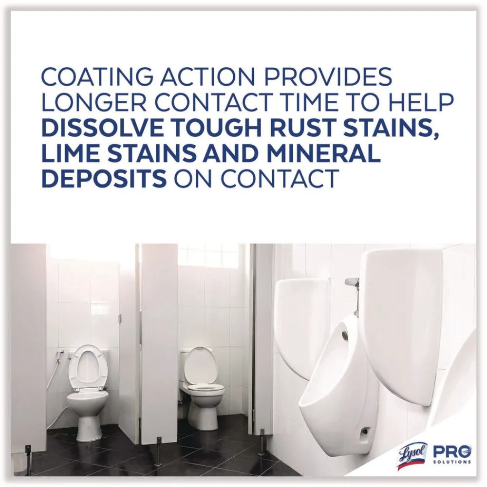 Clean, disinfect, and deodorize urinals and toilet bowls to give guests a clean bathroom experience. Meet staff and customer expectations around cleanliness with Lysol® Toilet Bowl Cleaner. Optimize restroom cleaning time with a powerful formula that works on the toughest toilet stains in seconds. Remove hard water deposits with the thick 9.5% hydrochloric acid formula that adheres to stains for better cleaning and coats the bowl above and below the waterline. Lysol kills 99.9% of viruses and bacteria when used as directed. Elevate restroom experiences throughout facilities for customers and staff with a powerful cleaning formula that helps leave surfaces shiny. Will not harm plumbing or septic systems.