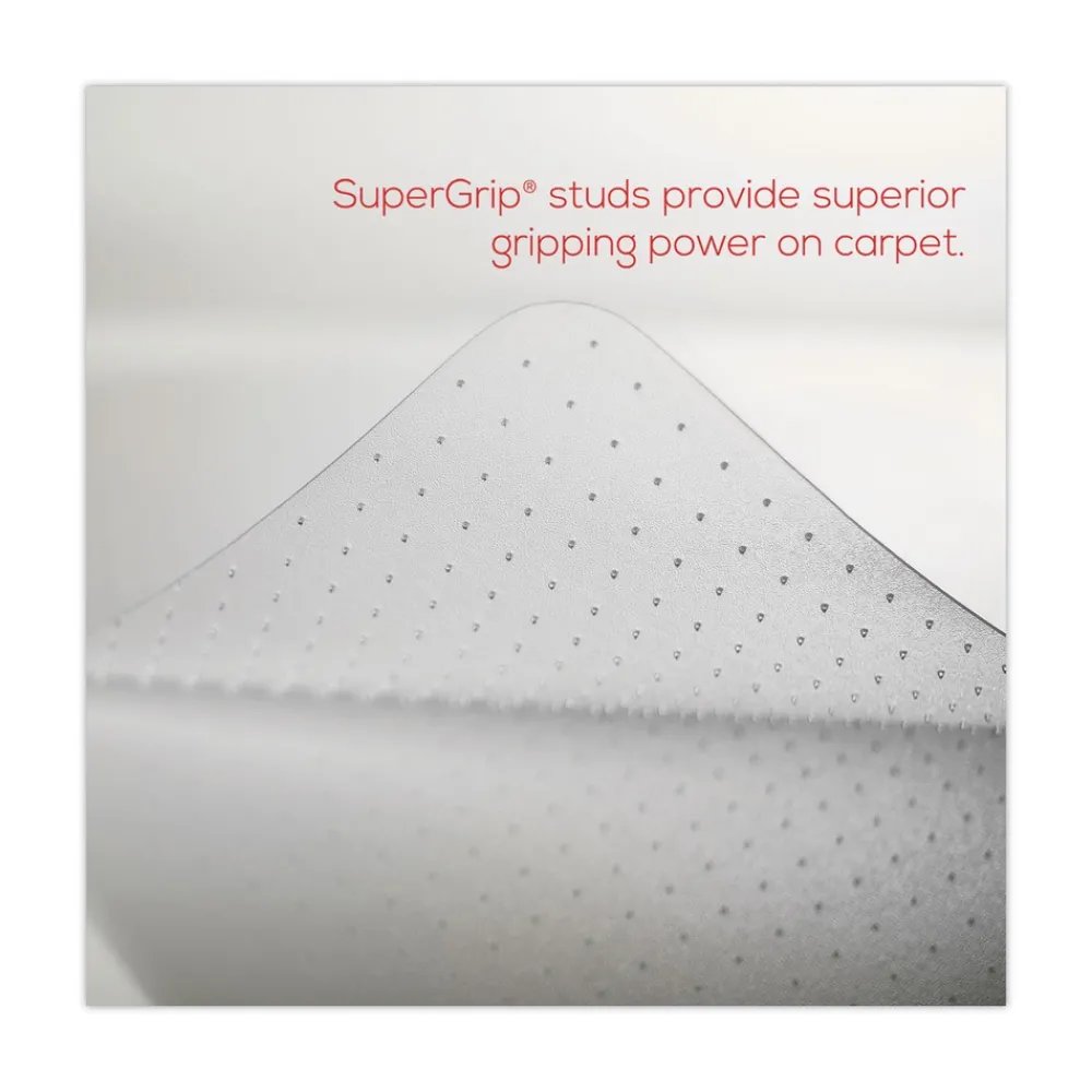 The SuperMat chair mat is a versatile choice for frequent use on carpets up to 1/2 in. thick and is well-suited for a variety of commercial and home office applications. Easy-glide rolling surface provides smooth chair movement to help minimize stress and strain on users back, legs and feet. Bottom studs grip the carpet securely and keeps the chair mat from moving. Deflecto’s Free and Clear non-orthophthalate, non-cadmium formula promotes a healthy work environment.