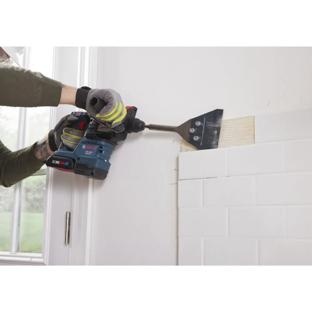 GBH18V-22K24 18V Brushless SDS-plus Bulldog 3/4 in. Rotary Hammer Kit with (2) CORE18V 4 Ah Advanced Power Batteries . The Bosch GBH18V-22 Bulldog hammer is a manageable, powerful rotary hammer designed to get the job done. It weighs 5.1 lbs. (tool only, not including battery) and delivers 1.4 ft-lbs. of impact energy (EPTA), for superior performance and impact-to-weight ratio. The hammer features a brushless motor, for extended runtime. It has Kickback Control, an integrated sensor to stop tool rotation in bind-up situations, and Vibration Control, for extended user comfort. The hammer features a variable-speed trigger, which allows for accurate bit starting. The included CORE18V 4 Ah Advanced Power Battery delivers 2X the runtime and 60% more power compared to the BAT612 18V 2 Ah Standard Power Battery. Designed for easier handling . The GBH18V-22 hammer has Vibration Control, which affords great user comfort for extended periods of work. The easy-to-handle L-shaped design provides better control when drilling overhead or in tight spaces. It comes with a 360-degree side handle, providing a variety of grip positions for maximum ease of use. It has Vario-Lock positioning to optimize the working angle when the tool is used in hammer-only mode. Legendary Bulldog impact . The GBH18V-22 provides a superior 1.4 ft.-lbs. of impact energy (EPTA), delivering maximum performance in heavy-duty drilling and chipping applications in concrete. The brushless motor and low weight of 5.1 lbs. (tool only, not including battery) maximize runtime for extended applications and provide an outstanding impact-to-weight ratio.
