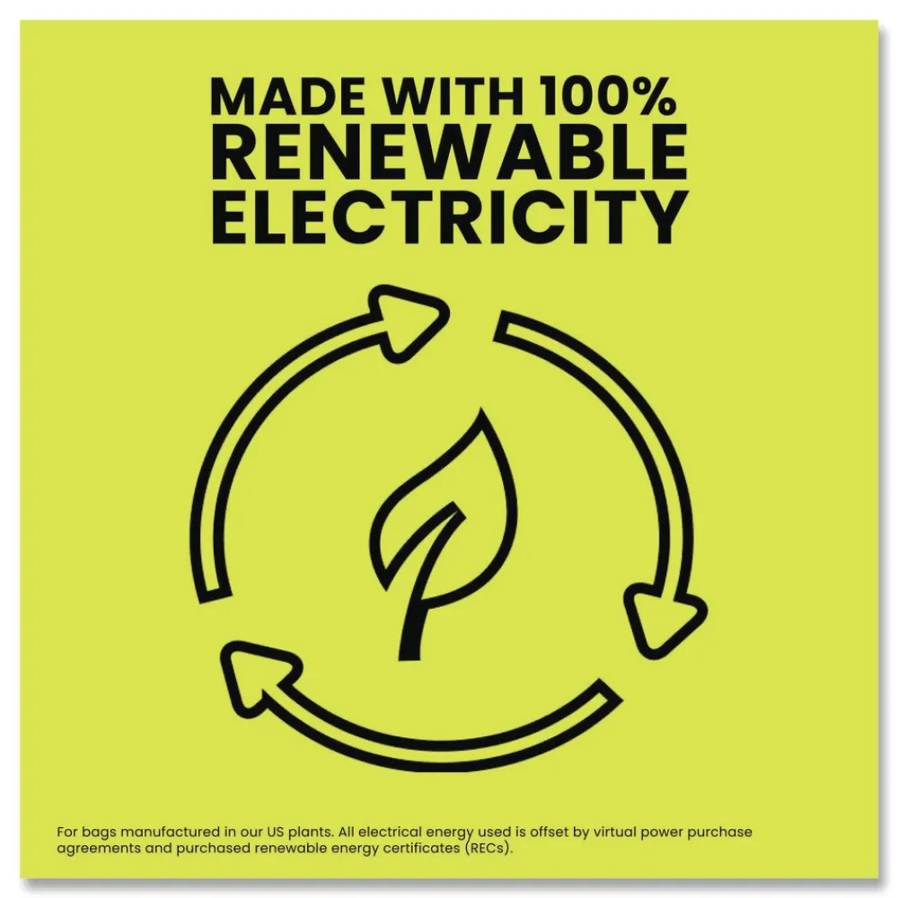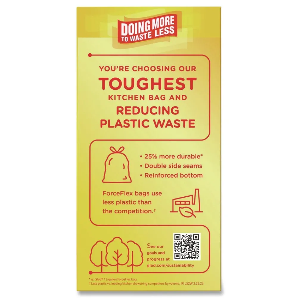Glad ForceFlex MaxStrength Tall Kitchen Trash Bags provide strength and Fresh Clean scent with Febreze to help your business smell fresh. These bags are 25 percent more durable with a 2X reinforced top to pull and carry, helping prevent rips at the top. It also features an outer leak protection layer and inner layer that stretches to help prevent rips and tears. Great for commercial facilities like restaurants, offices, cafeterias, schools, gyms, studios and more, these bags feature OdorShield technology that provides odor control to help fight smells. Made with 100 percent renewable electricity for bags manufactured in our US plants. All electrical energy used is offset by virtual power purchase agreements and purchased renewable energy certificates (RECs).