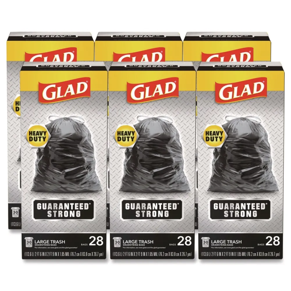 Glad 78966 Guaranteed Strong 30 in. x 33 in. 1.05 mil 30 Gallon Three-Ply Large Drawstring Trash Bags – Black (168/Carton)