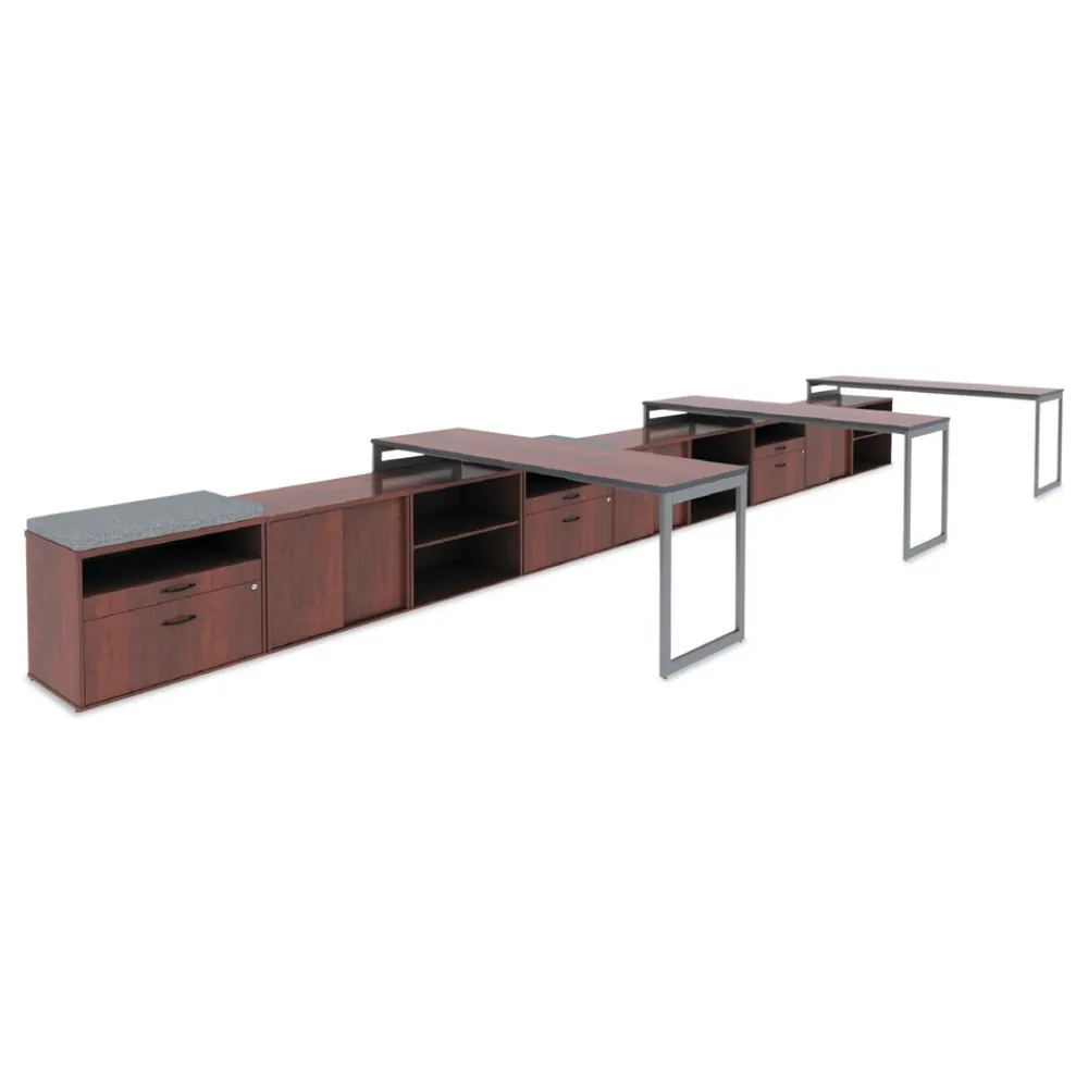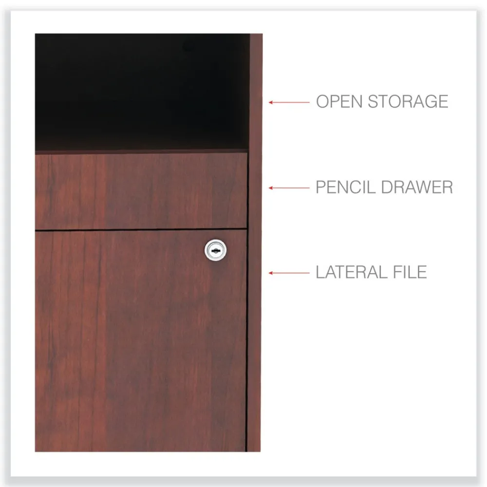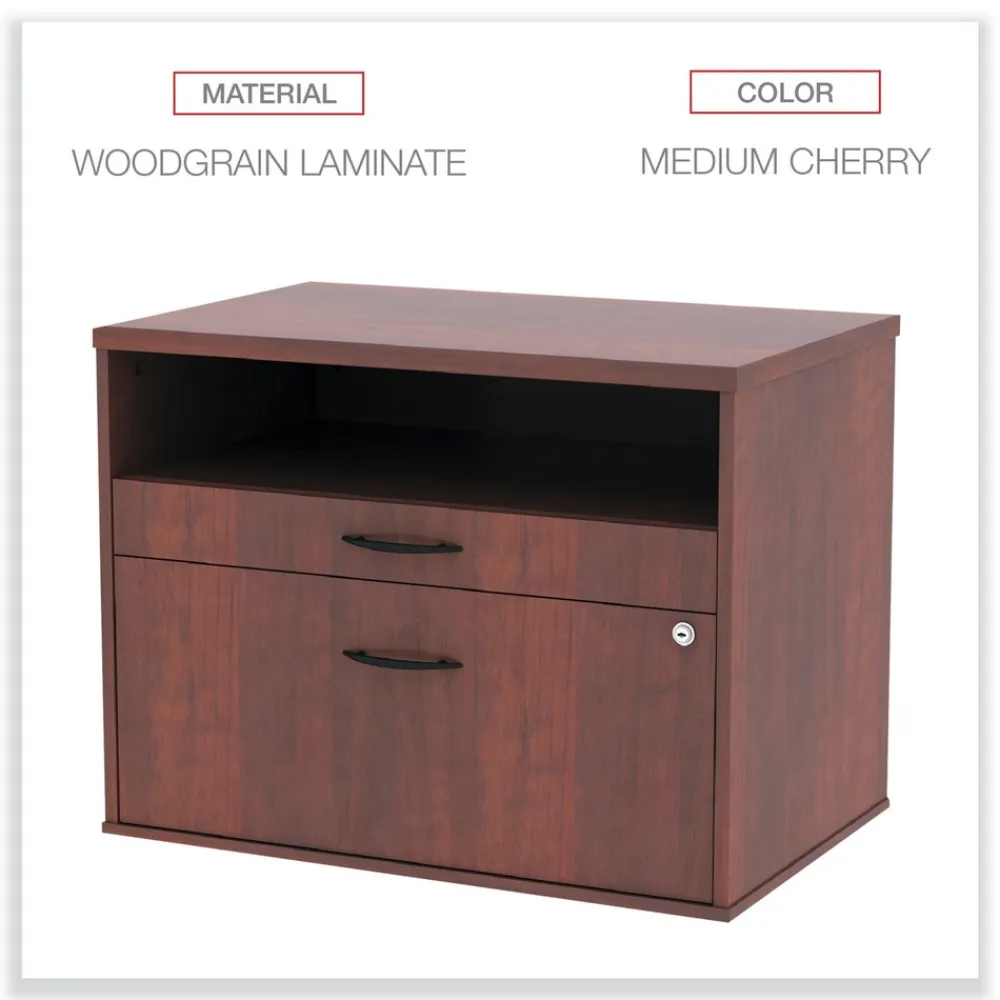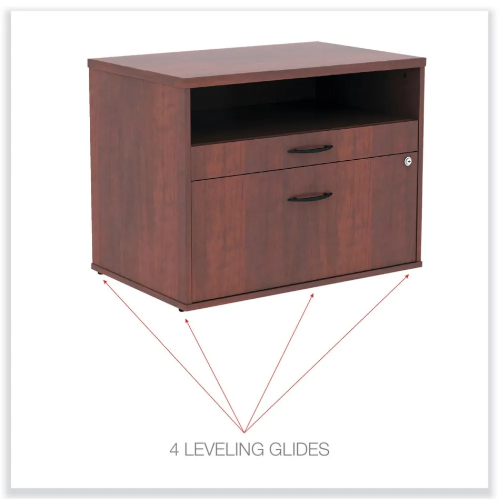 Sturdy file cabinet holds letter or legal files and is great for storage or as a low credenza with your desk. Can be used as a return to expand your desk space to create “L” or “U” shaped desk configurations. Coordinating laminates for use with Alera Valencia, Sedina, or Open Office Desk Series. Three storage spaces including lateral file drawer, pencil drawer, and open storage. Full extension, ball-bearing slides for easy access to everything. Configurable left or right-handed. Durable woodgrain laminate is scratch, dent, and water-resistant. Leveling glides compensate for uneven floors. Two, fold-away safety keys.