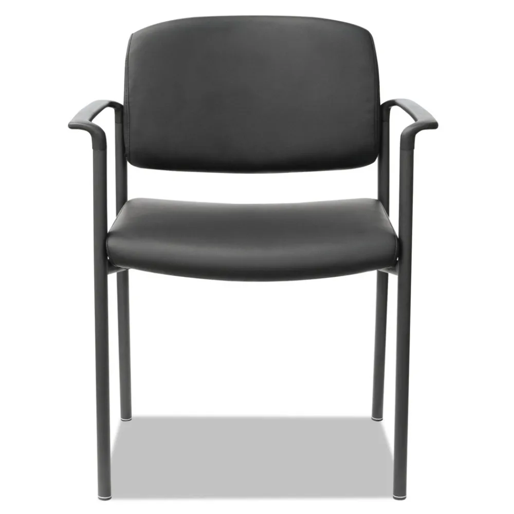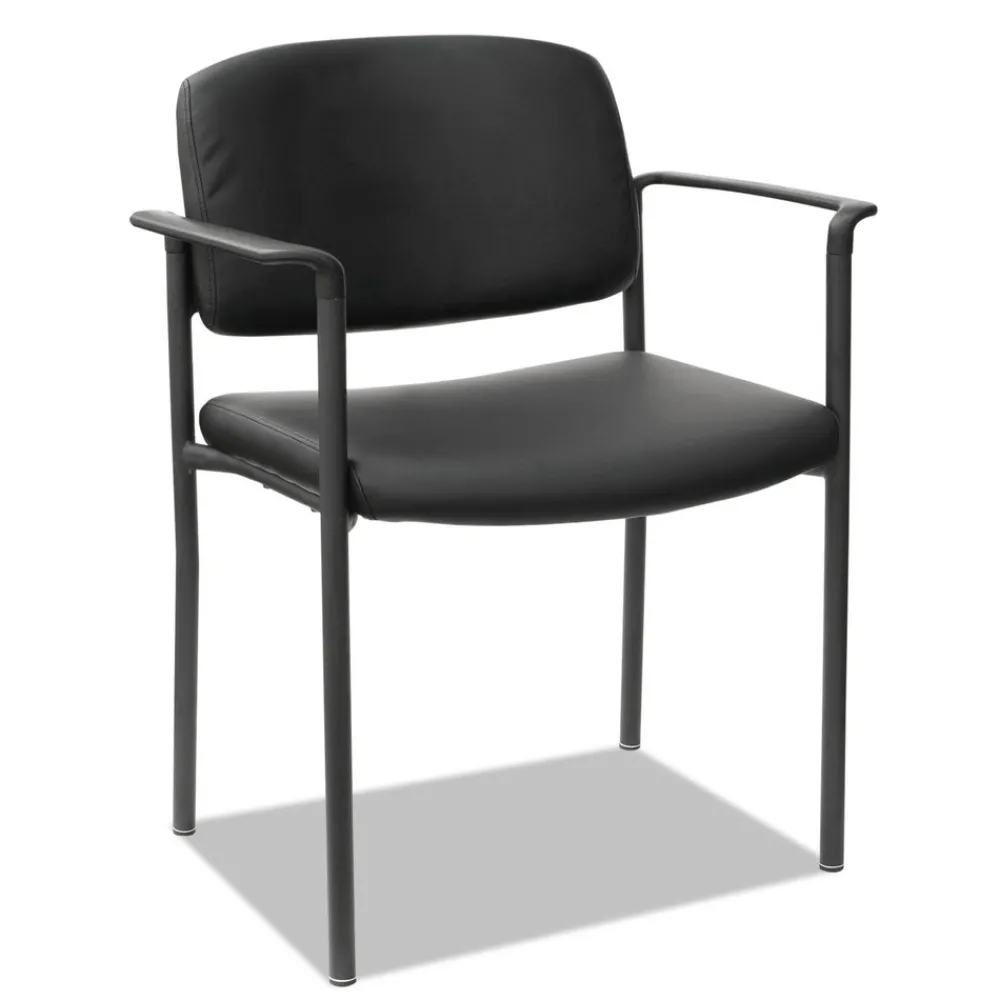 Multi-purpose chair with black PVC-free faux leather upholstery. Ultra-cushioned seat and back for enhanced comfort. Perfect for waiting areas, conference rooms or guest seating. Steel base with straight legs for strength and durability. Stacks up to five high.