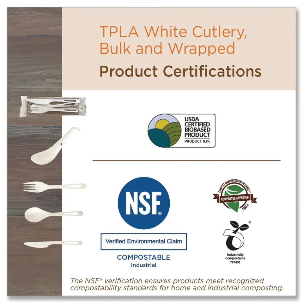 Made entirely of non-GMO corn-derived polylactic acid (PLA) with talc-mineral fillers, a safe, non-toxic, low-waste alternative to plastic, get all the benefits of plastic cutlery without the downsides. PLA Compostable Cutlery is great for restaurants, cafes, ice-cream and sandwich shops, cafeterias, food trucks… almost anywhere you’d typically want a disposable plastic option. Sturdy and reliable, PLA utensils are suitable for serving cold, cool and moderately warm foods and beverages up to 120 degrees F. Reusable and dishwasher-safe. These utensils fully compost in three to six months within commercial composting facilities.