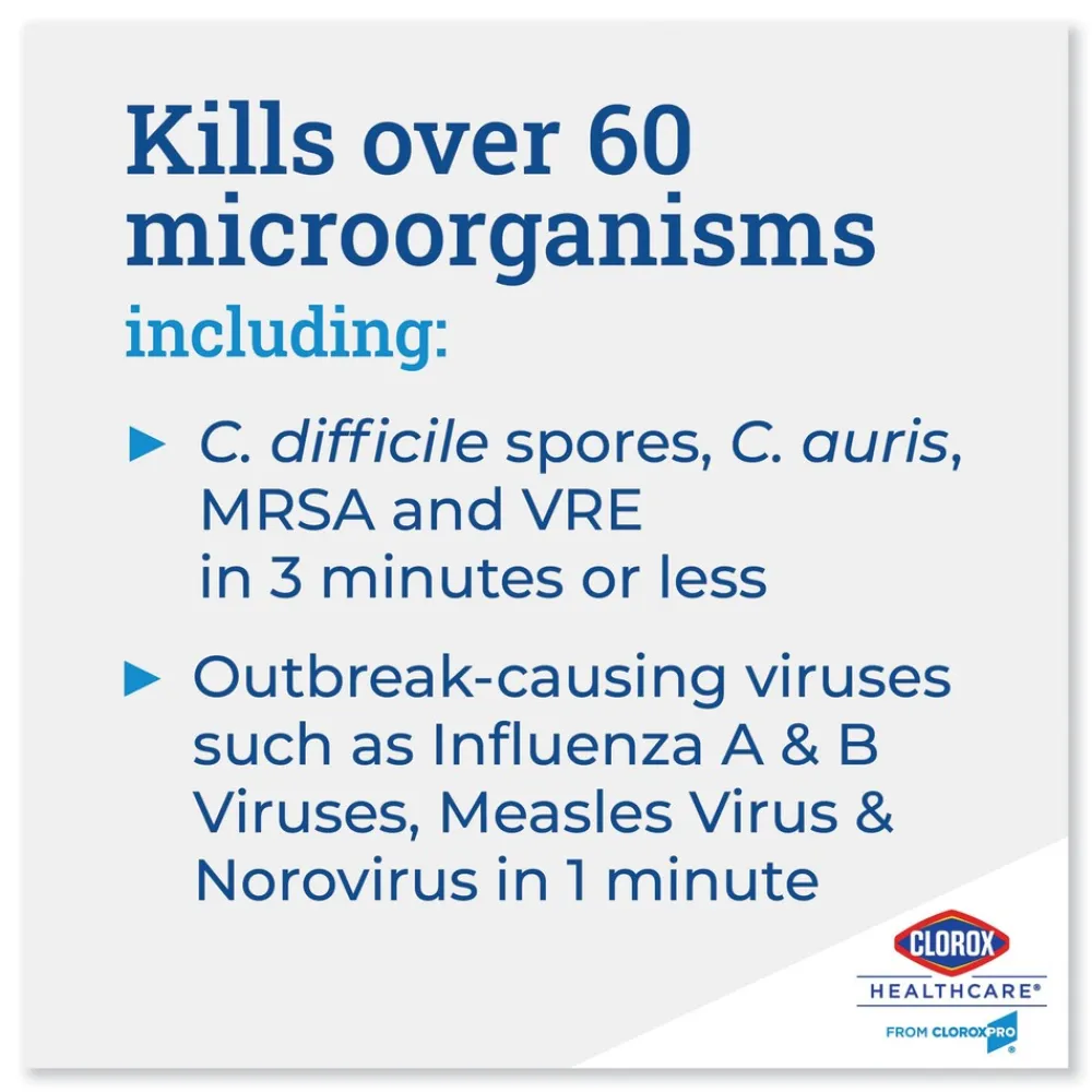 Faster cleaning power than competitor, these wipes kill over 60 microorganisms, including outbreak causing viruses, emerging viral pathogens, MRSA and VRE in three minutes or less