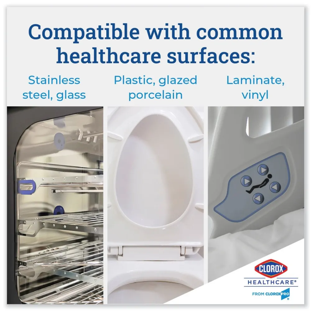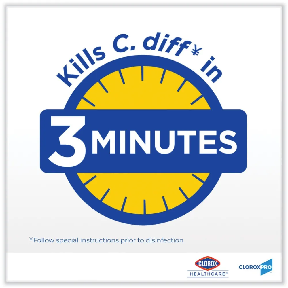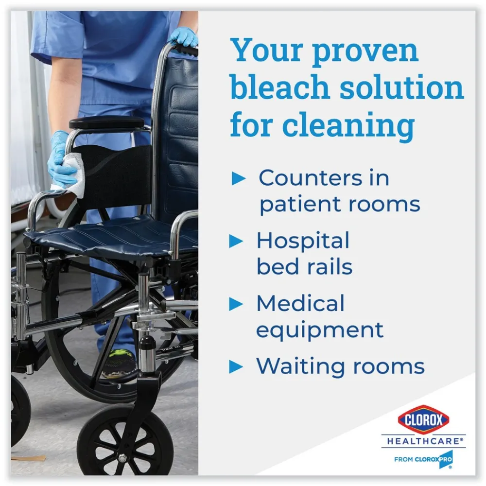 Your proven bleach solution for cleaning. Clorox Healthcare® Bleach Germicidal Wipes kill C. difficile and C. auris in three minutes and 58 other microorganisms in one minute or less, including outbreak causing viruses, emerging viral pathogens, MRSA and VRE when used as directed. With superior surface compatibility on a wide range of hospital surfaces, these disinfecting wipes help you cover more square footage per wipe with fast contact times and greater wetness surface coverage than the leading competitor. The phosphate free formula is optimized to be easy on surfaces and leaves less residue behind. Use in healthcare settings including hospitals, medical facilities, outpatient facilities and long term care facilities. Follow special instructions for cleaning prior to disinfection.