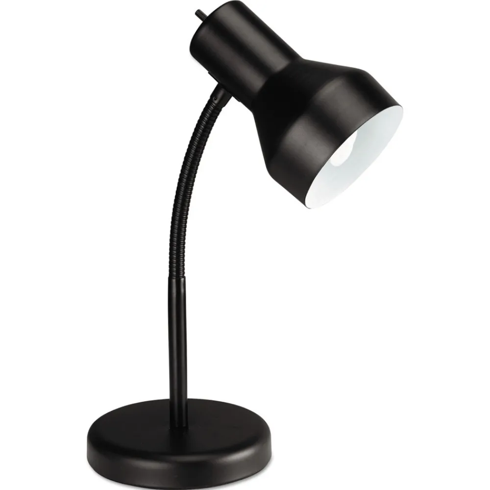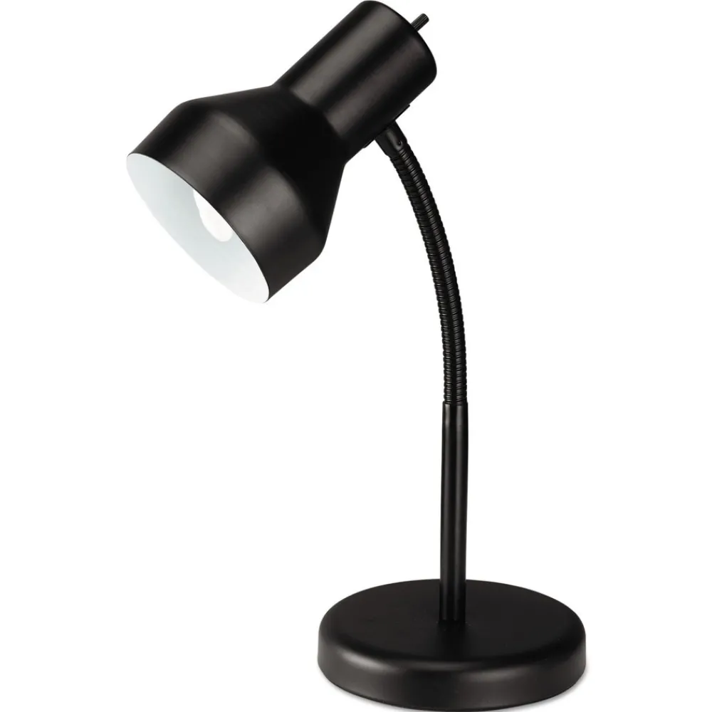 Make a smart, economical choice with these task lamps. Fully adjustable gooseneck arm to aim light where you need it most. Classic shade styling in matte black finish. Non-skid secure mounting clip or weighted-base options. Protective pads protect against surface marks or scratches. Rotary on/off switch conveniently located on base. Ideal for compact spaces. All metal construction for maximum durability. 13W CFL bulb is included.