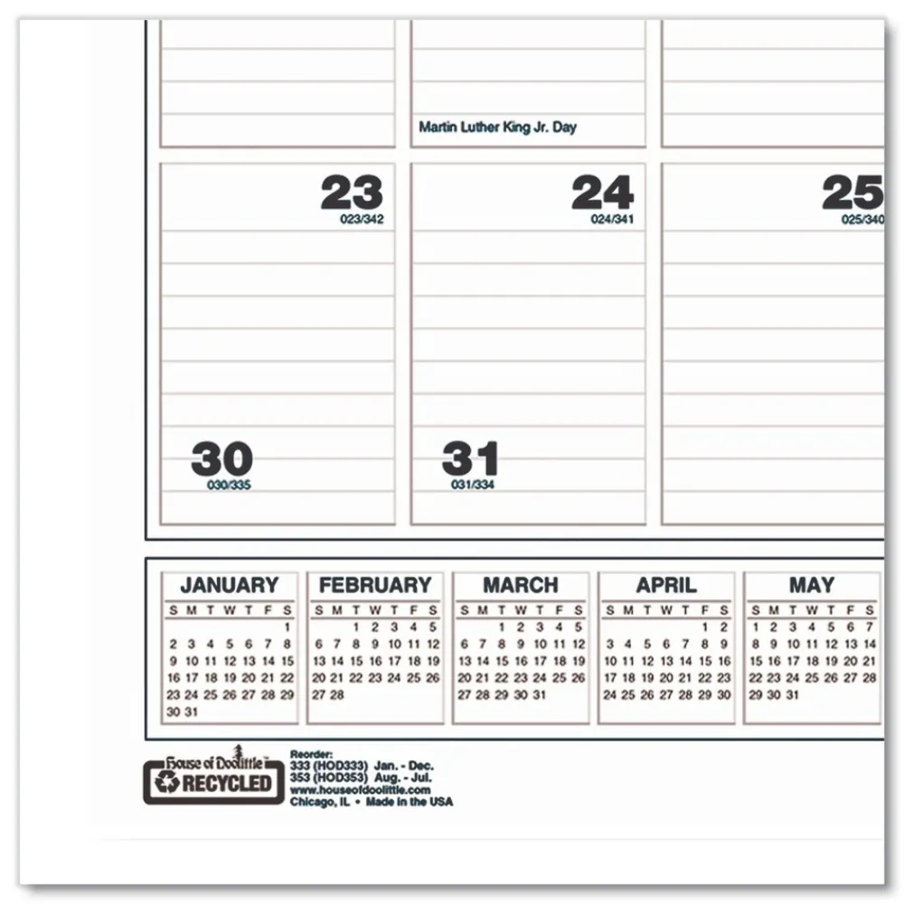 Ruled daily blocks keep notations neat. Full-year reference calendar aids in planning throughout the year. Neutral graphics match any decor. Wirebound with a full chipboard backer and a sturdy wire hanger. Made entirely of recycled materials.